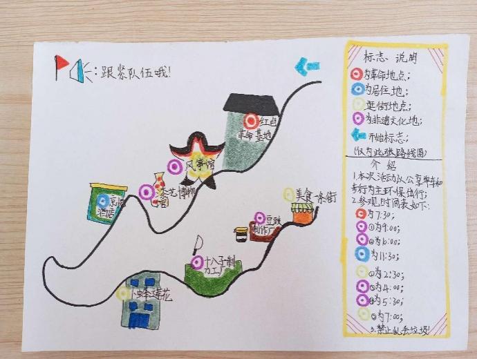 答疑環節結束后,學生們隨即在小組內展開激烈的討論。每個人各抒己見,結合活動規則,從作品內容的選擇到路線設計的規劃到每位成員工作內容的分配,都進行了深入的交流。本次討論,有利于學生產生清晰的思路,同時明確自身在小組中所負責的內容。學生們充分利用預留的課堂時間及課余時間,以小組合作的形式,發揮團結協作的精神,從搜集資料、準備材料及工具、繪畫、撰寫文字說明等方面著手,積極參與到作品創作的過程當中,有利于在鍛煉動手能力的同時充分展現自身豐富的想象力與創造力。歷經幾天的精心創作,一份份各具特色的作品被打磨而成。