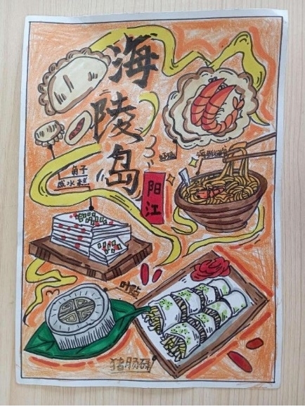 在所有學生展示的作品中,既包括采用一類資源為主題以集中體現陽江特色文化的形式,也有囊括各種景點以展示陽江豐富文旅資源的作品。內容選擇上,既有豬腸碌、咸水糕等陽江特色美食,也有海陵島、東平大澳漁村、珍珠灣等海洋旅游資源,更有漆藝、風箏等非遺技藝。多種多樣的作品百花齊放,利于從多個角度詮釋對于家鄉文化的理解,展現陽江這座城市的魅力。