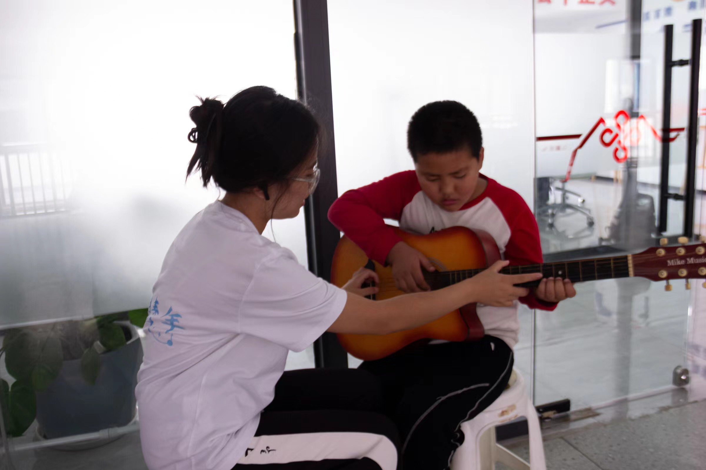 圖為志愿者教感興趣的小朋友彈吉他(何維希攝)