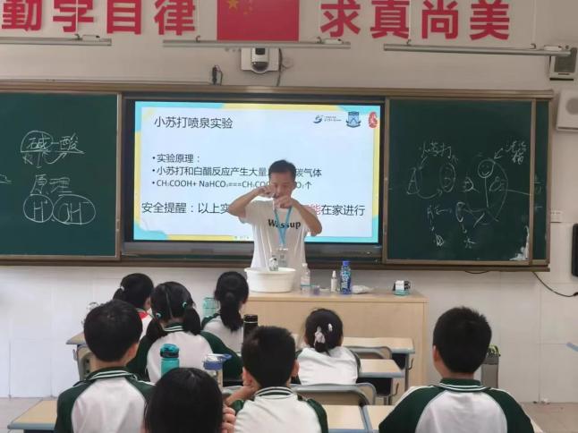 在“小蘇打大魔力”課程中,黃坤與同學(xué)們揭秘小蘇打的神秘身世,從它的起源、悠久歷史一直到如今在各個(gè)領(lǐng)域的驚人應(yīng)用,比如烘焙、清潔、甚至醫(yī)療,接著黃坤以更加貼合學(xué)生學(xué)情的方式,帶同學(xué)們了解小蘇打的“魔法成分”,以及在化學(xué)反應(yīng)中扮演的角色。然后黃坤向同學(xué)們科普酸堿性,使用pH試紙測定小蘇打和醋酸,同時(shí)給同學(xué)們發(fā)放pH試紙。課堂后期,黃坤與同學(xué)們跳出課本,去發(fā)現(xiàn)小蘇打在廚房、家務(wù)中的神奇功效。最后黃坤向同學(xué)們進(jìn)行實(shí)驗(yàn)展示,使用小蘇打、醋酸、洗潔精、塑料瓶制作“小蘇打噴泉”,實(shí)驗(yàn)效果顯著,收獲較好的課堂效果,深受學(xué)生歡迎。