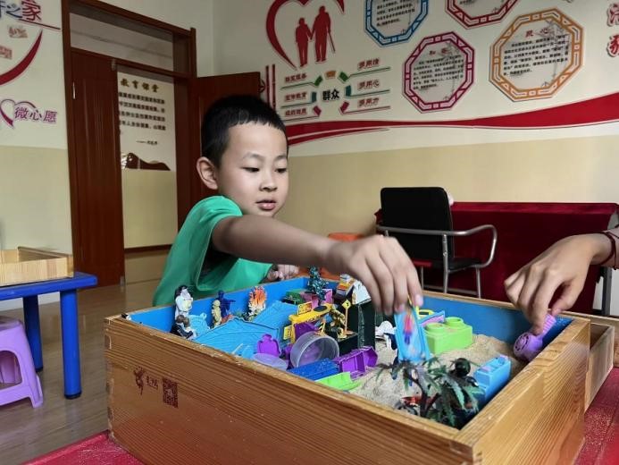 此次支教活動,團隊成員李紫璇精心準備了豐富的沙盤游戲材料,并邀請了專業的心理咨詢師進行指導。在頤和社區的教室里,孩子們圍坐在沙盤旁,臉上洋溢著好奇與興奮。在小李老師的引導下,他們開始動手搭建自己的“小世界”。“我建了一個大大的城堡,里面有我和爸爸媽媽。”一個小朋友興奮地介紹著自己的作品。而另一位小朋友則選擇用沙子塑造出一幅幅生動的自然景象,表達著對大自然的熱愛與向往。通過沙盤游戲,小李老師發現,許多平時內向、不善言辭的孩子在游戲中展現出了驚人的創造力和表達能力。他們通過沙盤表達出自己的內心世界,與志愿者建立起了信任的橋梁。