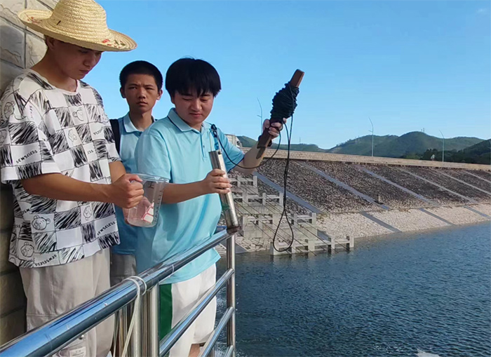 圖為實(shí)踐隊(duì)員與惠女水庫工作人員一同取水樣