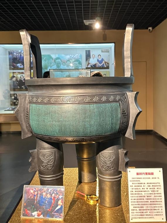 在充分了解黑陶歷史后,團隊成員參觀了博物館內的幾件鎮館之寶。被譽為“天下第一蛋殼陶”的黑陶工藝品,充分展現了黑陶黑如漆、亮如鏡、薄如紙、硬如瓷的特點。觀察黑陶表面精細的細紋與結構,隊員們對黑陶手藝者的智慧和技藝表示由衷的贊嘆。此外,他們還欣賞了采用微雕工藝雕刻有十九大報告的《新時代黑陶鼎》,不僅體現了黑陶文化的傳承與發展,也展現了新時代背景下黑陶文化的勃勃生機。