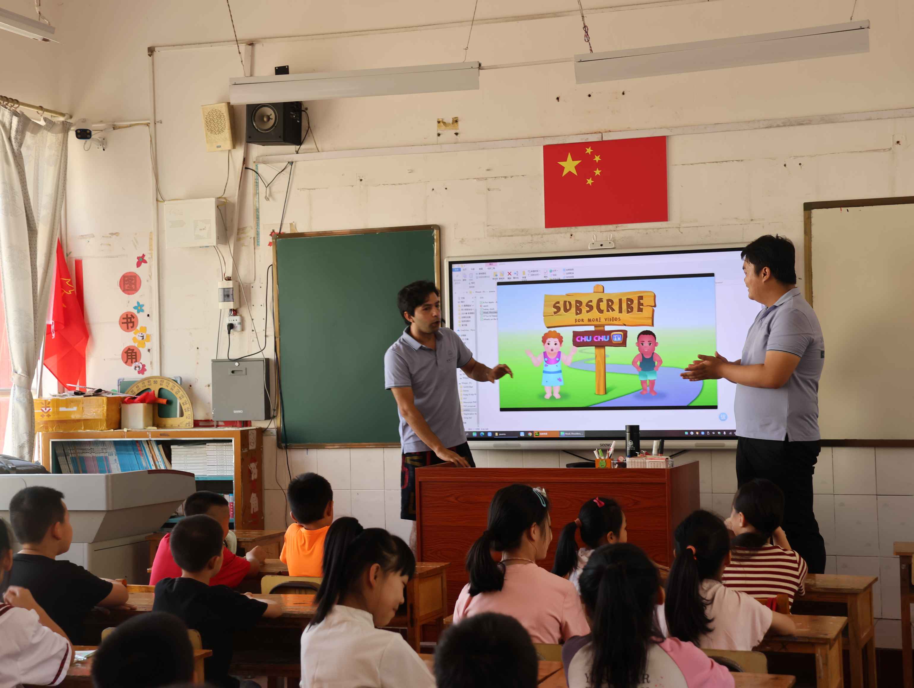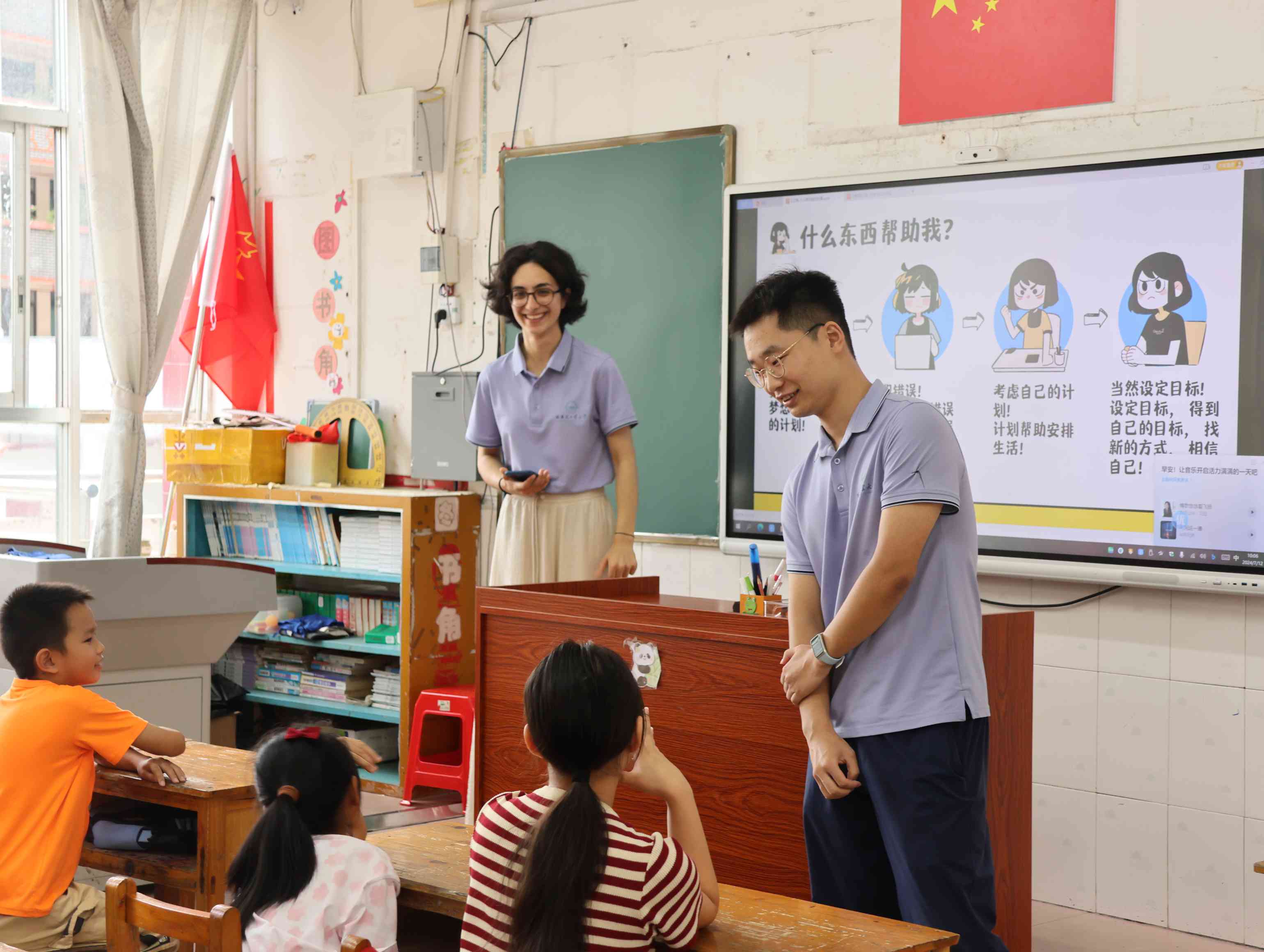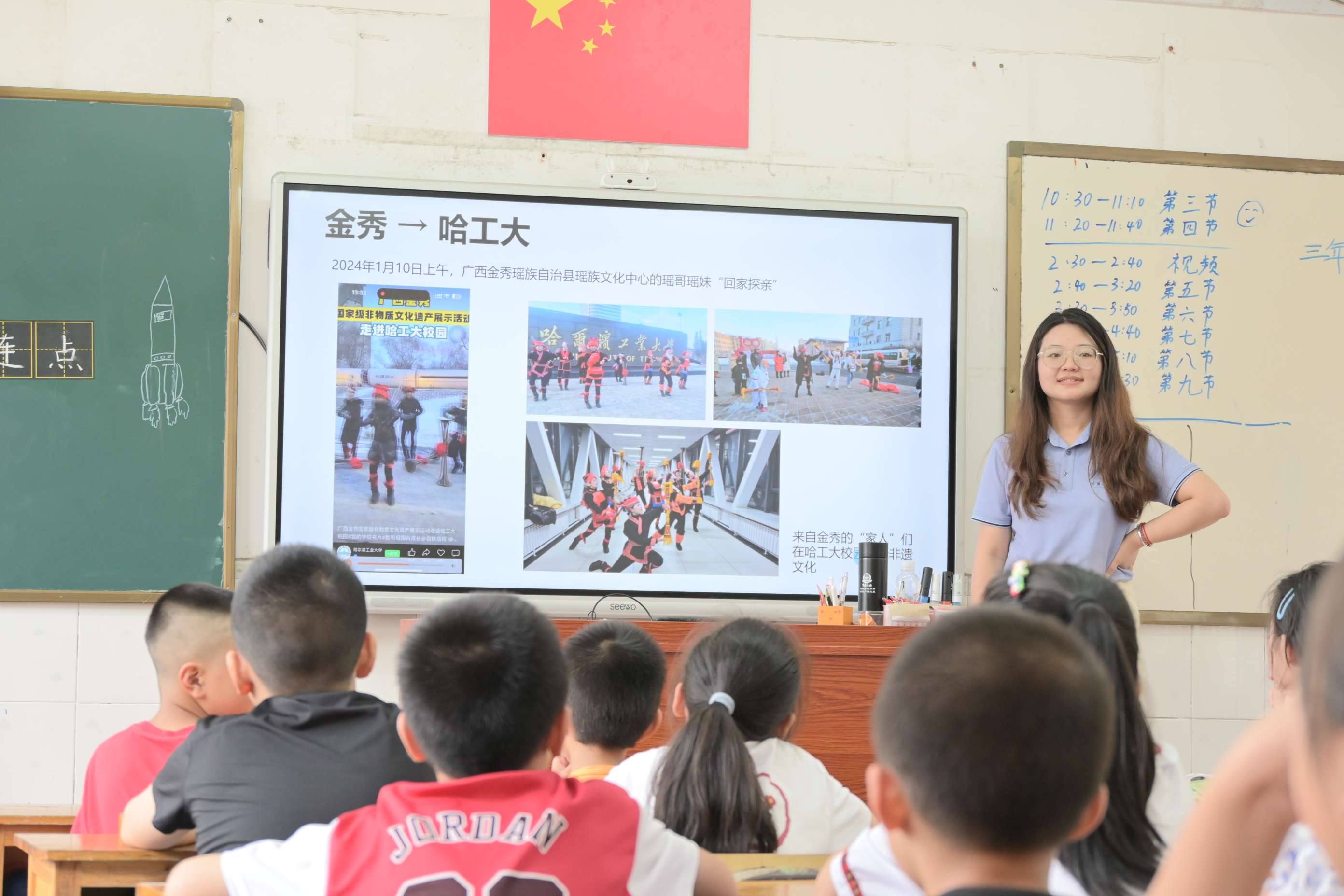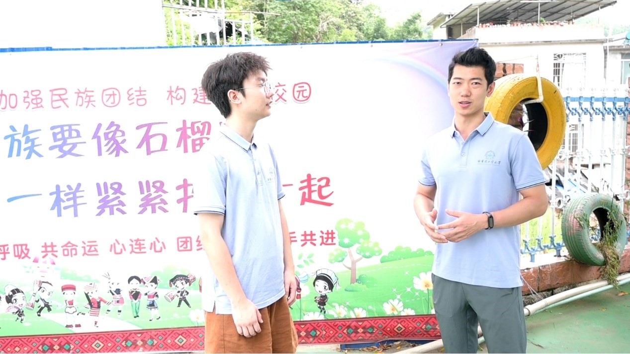 在支教的過程中,隊(duì)員們不僅是知識的傳遞者,更是文化的交流使者。支教不僅是教孩子們知識,更要教他們學(xué)習(xí)去愛,去感受這個(gè)世界的廣博與精彩。來自不同國家、不同民族的隊(duì)員們,與孩子們分享著各自的文化故事,讓小小的教室成為了多元文化的交匯點(diǎn)。臺上的隊(duì)員長著各式的面孔、說著不同的口音,共同來到金秀澆灌祖國的花朵;而臺下的小朋友生長在這片瑤族聚居的大山中,穿著瑤族風(fēng)情校服,也向往著走向祖國廣闊的山水,追求更美好的人生。彈琴、高歌、共舞、傳道受業(yè)解惑,孩子們很快便愛上了這些遠(yuǎn)道而來的客人。