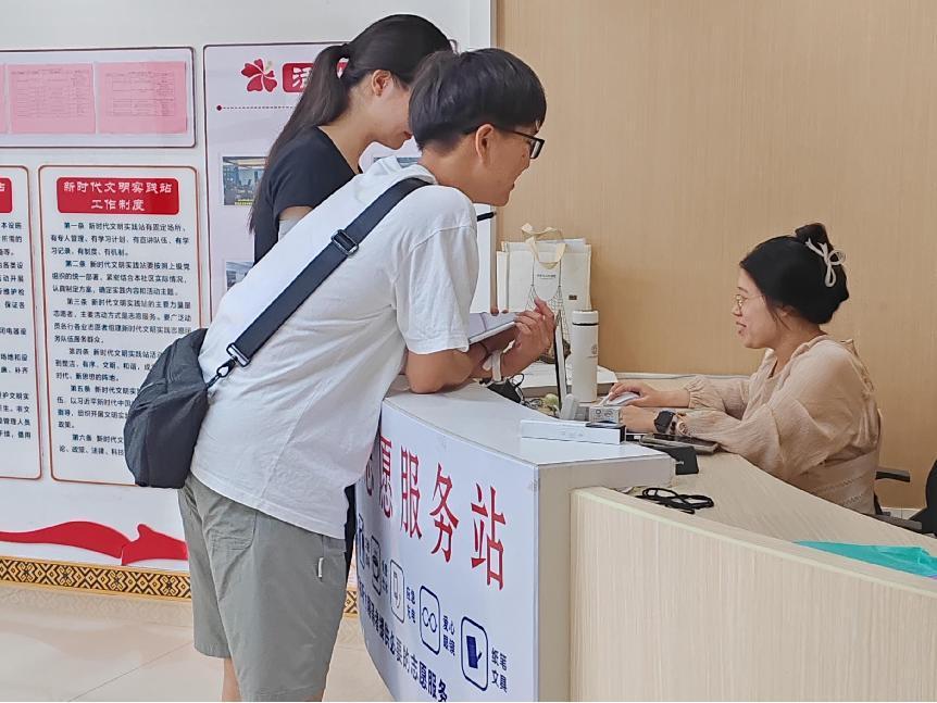 圖為團(tuán)隊成員與社區(qū)志愿服務(wù)站工作人員進(jìn)行訪談。劉文霞 攝 開展問卷調(diào)查,助力社區(qū)建設(shè)