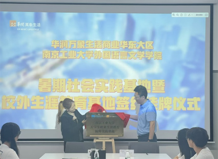校企合作,簽約啟航: 城北萬象匯總經理董瑩瑩等華潤萬象生活有限公司相關負責人對外國語言文學學院社會實踐團表示熱烈歡迎,希望團隊成員能夠將將理論與實際相結合,堅持學以致用,練就過硬本領,以實踐學習推動專業能力提升,希望雙方進一步加強合作,為公司輸入更多的優秀人才。雙方就學生生源、公司發展以及人員招聘等進行了深入的交流和探討。在會上,南京工業大學外語學院黨委書記張翔與華潤萬象生活有限公司城北萬象匯總經理董瑩瑩就學生生源、就業方向、企業發展等展開了討論,并提出了未來學校與企業發展可行性的合作方案,以及赴企業發展前景。此外,雙方還與在集團就業的南工大校友進行了親切座談。隨后,張翔書記和高潔副書記為“南京工業大學—大學生生涯教育校外實踐基地”揭牌,并簽署合作協議。