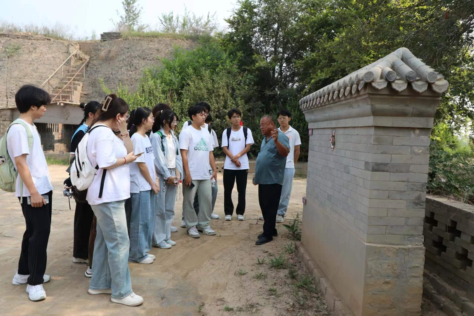 志愿者在臨清貢磚燒制技藝代表性傳承人——趙慶安師傅的帶領下參觀了貢磚文化產業園區,了解了貢磚的歷史以及制作流程,參觀結束后,趙慶安師傅解答了有關貢磚被皇家喜愛的原因、制作流程中的關鍵步驟、如何辨別出蓮花土以及當下用途等疑問。
