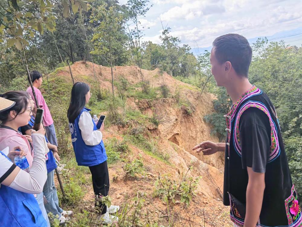 圖為楊林港村民董老師帶領調研隊成員們參觀因盜礦者非法盜采磷礦而導致的塌方。通訊員顧紫賢攝