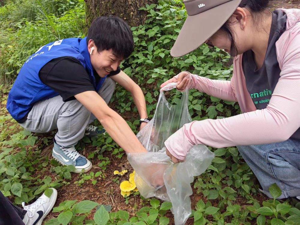 圖為調研隊成員協助楊林港村民采摘當地培育的人工雞油菌。通訊員顧紫賢攝