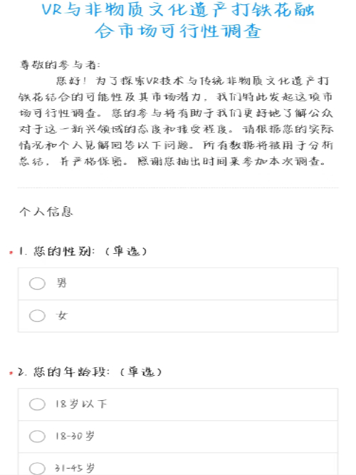 調研過程中,實踐團成員走訪村戶60余戶,訪談鐵花秀現場觀眾40余人,召開座談會收集各村干部意見10余條,發放問卷132份,較全面地了解群眾對于傳統打鐵花的看法,收獲了群眾對于“VR+打鐵花”這一創新模式的寶貴意見。這些數據和反饋將有助于團隊更精準地把握市場需求,推動非遺項目的創新與發展。