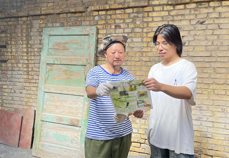 7月8日-9日,“智農振興,領航發展”隊在村干部的帶領下前往村子,挨戶發放自制海報與病害應對手冊,確定爆發的蟲害種類及現有預防應對措施,采集病害數據集。通過普及推廣,積極引導農民使用科技手段識別病蟲害,提高防治效果,保障農作物的產量和品質。