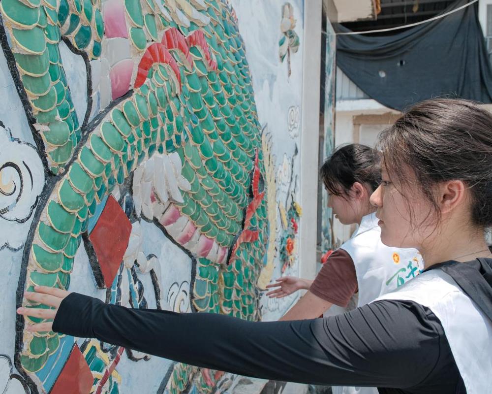 圖為實(shí)踐團(tuán)成員參觀嵌瓷 (廣東財(cái)經(jīng)大學(xué) 王鈺菁 攝)