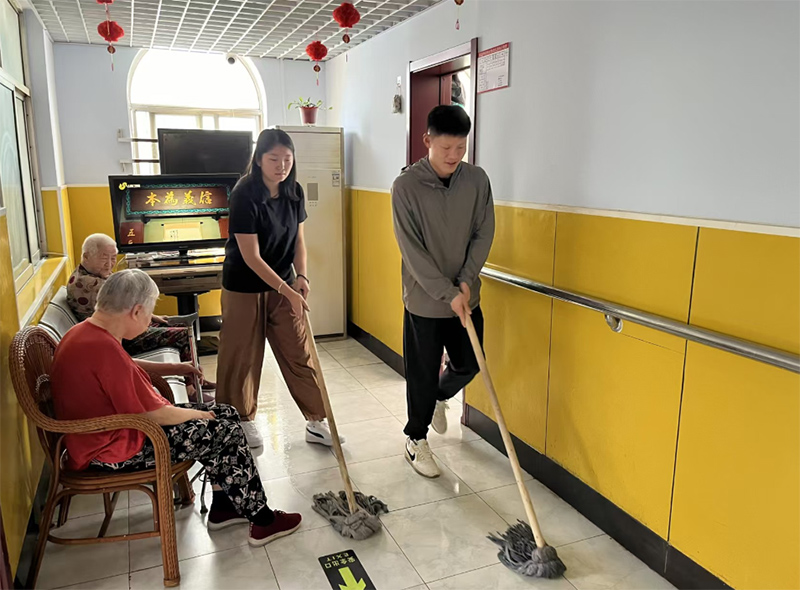 打掃衛生,提供美好環境。實踐團成員們第一天對老人房間內的雜物、垃圾進行統一清理,對敬老院的庭院、走廊等進行全面的清潔,創造更舒適的居住環境。