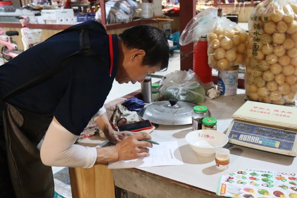 次日清晨的菜市場(chǎng)街頭,我們與小攤販們宛如家人親朋,知心好友,坐在一起以談天的方式聊聊法律。當(dāng)溝通障礙出現(xiàn)時(shí),我們便用通俗易懂的白話耐心地講給爺爺奶奶們聽(tīng);當(dāng)老百姓們有不懂的法律問(wèn)題時(shí),我們便以自己最有把握的法律知識(shí)細(xì)心地為群眾們答疑解惑;當(dāng)有大爺向我們吐槽自己的合法權(quán)益正遭受侵害時(shí),我們則趁機(jī)向他普及了勞動(dòng)法的相關(guān)內(nèi)容,介紹了一些合法途徑,提醒大爺可以通過(guò)法律途徑解決問(wèn)題……菜市場(chǎng)里熙熙攘攘,人聲鼎沸。大家身著統(tǒng)一的服裝,手持調(diào)研問(wèn)卷和筆記本,我們一行人懷揣著對(duì)了解村民法治素養(yǎng)現(xiàn)狀的期待,滿腔熱情地穿梭在擁擠的攤位間去感受陽(yáng)光的炙熱、傳播法律的溫情!