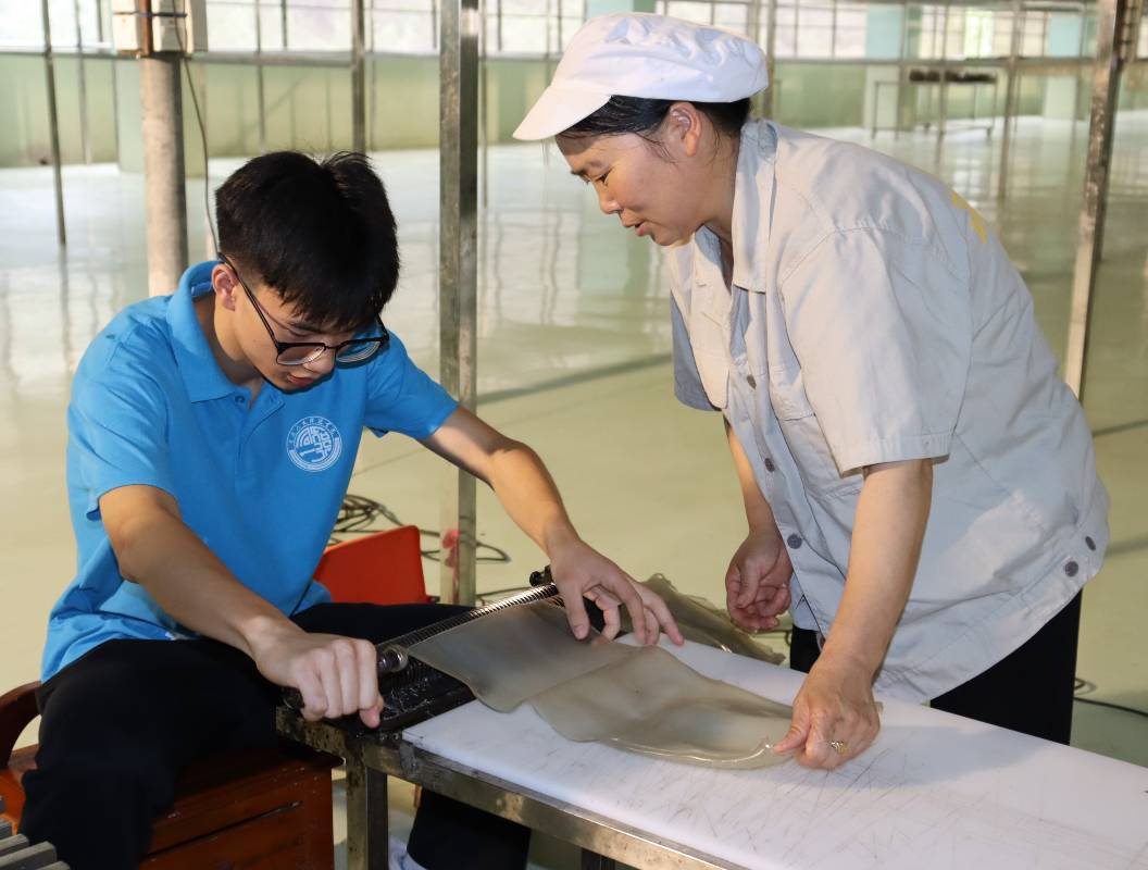 葛先萍女士熱情接待了實(shí)踐團(tuán),她從紅薯衍生品陳列館,到黨建文化墻,再到非物質(zhì)文化遺產(chǎn)生產(chǎn)性保護(hù)基地向?qū)嵺`團(tuán)進(jìn)行了詳細(xì)的介紹。實(shí)踐團(tuán)成員從中了解到了晶絲苕粉的產(chǎn)品特點(diǎn)、制作加工、以及紅薯種植技術(shù)共享等內(nèi)容。實(shí)踐團(tuán)成員也應(yīng)邀親自體驗了晶絲苕粉的加工和制作。
