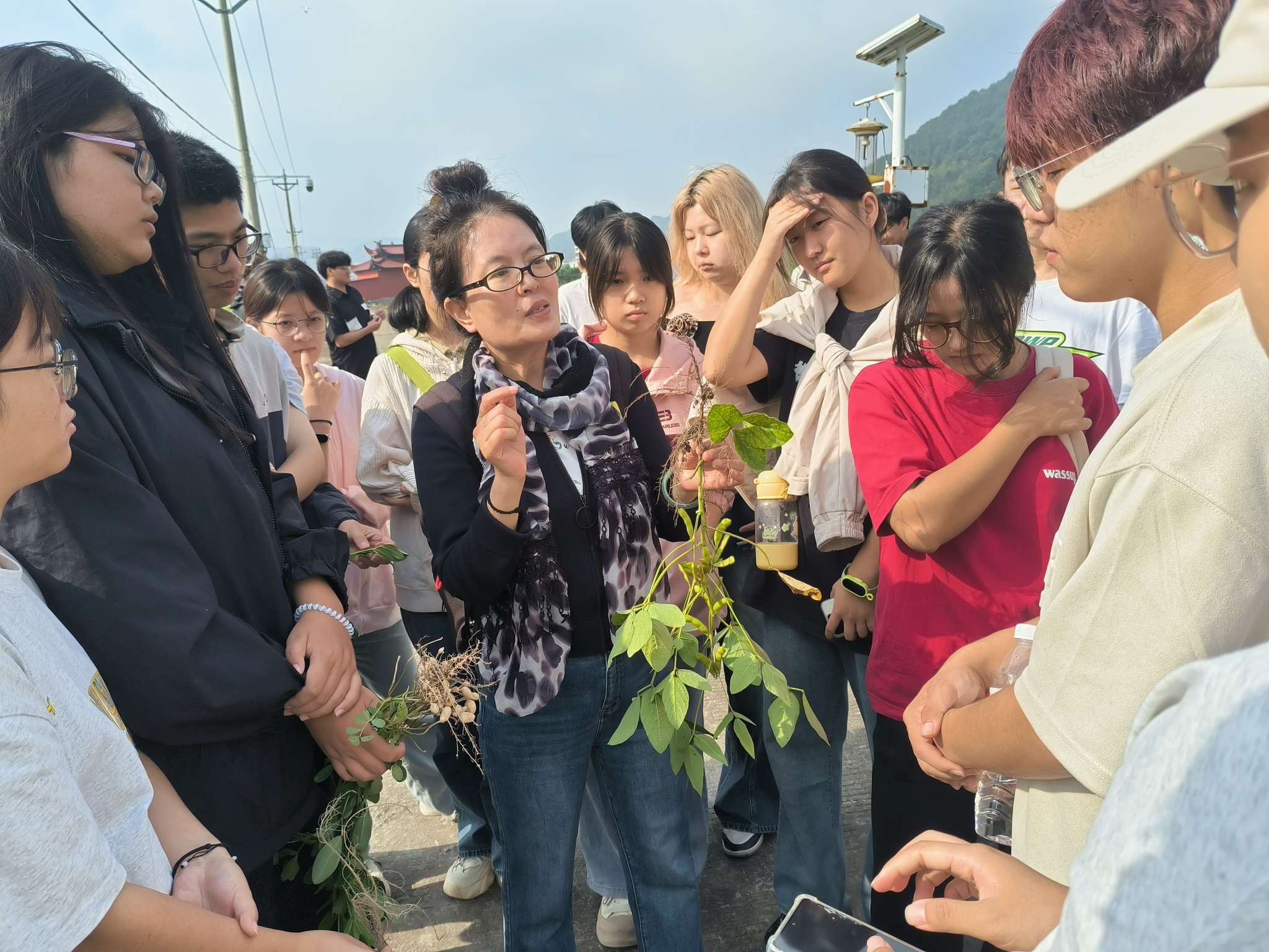 在高文霞老師的引導下,同學們首先來到花生種植區觀察學習。高文霞老師以實際植株為例,著重指出花生形態結構,從根莖葉到果實向同學們詳細闡述了植株特點,從實際情況入手觀察,便于同學們專業基礎知識的學習,使其記憶更加牢固,同學們也對高文霞老師的授課方式表示認可。