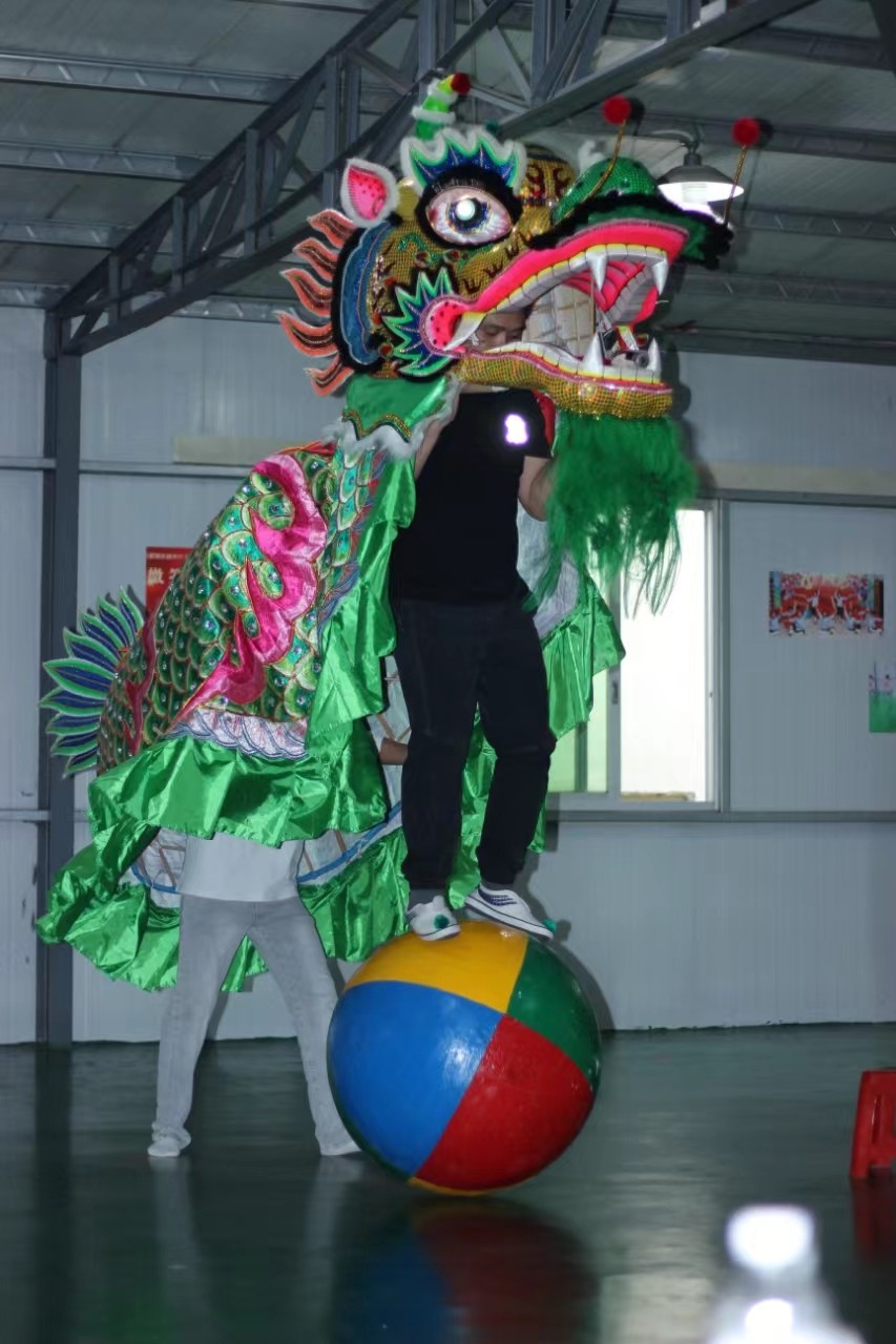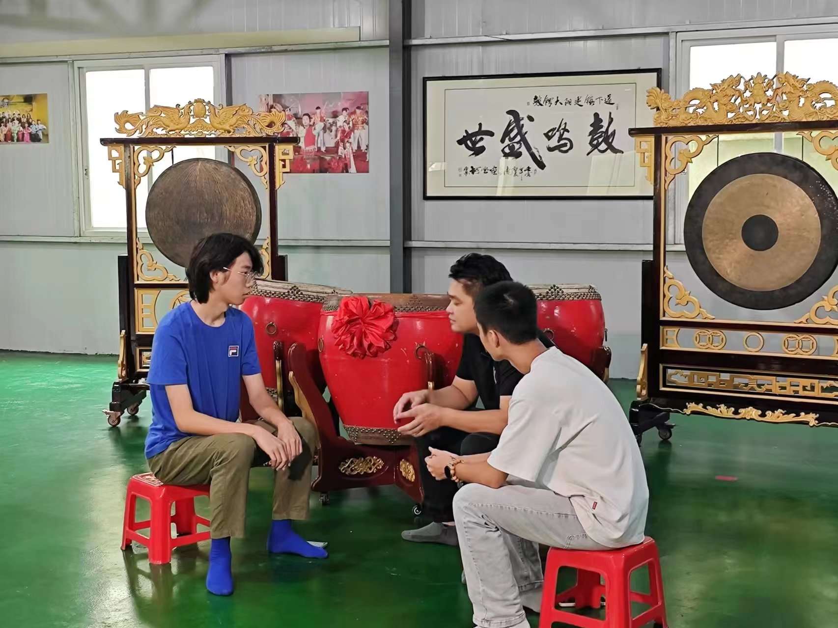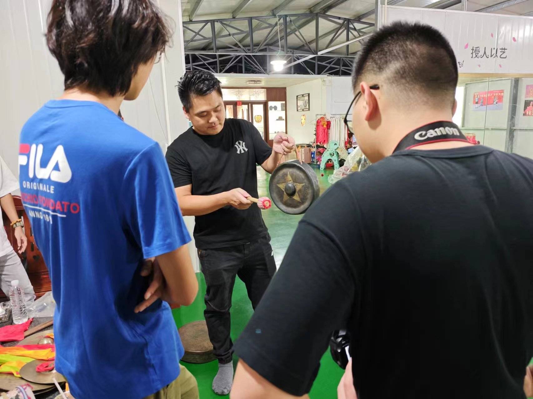 下午我們到了另外一個地方采訪潮州大鑼鼓的非遺傳承人。即使只有兩個人,當他們打起鼓、敲起鑼時,那氣勢卻令人心潮澎湃,我仿佛回到了游神時的熱鬧場景。而后章勃兄教我們如何執槌、打鼓、打鑼。在他的指導下,我敲起大鑼,那種令人震撼的聲音傳入耳朵,瞬間喚醒了從小到大圍觀游神時的DNA,之前都是看別人敲,現在輪到我成為局中人,有種很奇妙的感覺。我們團隊還體驗了踩球、戴頭套、觀看麒麟噴火等活動,不亦樂乎。