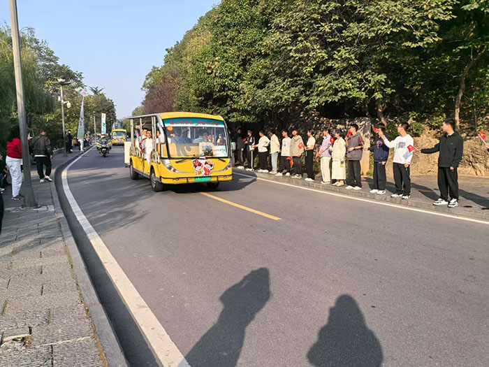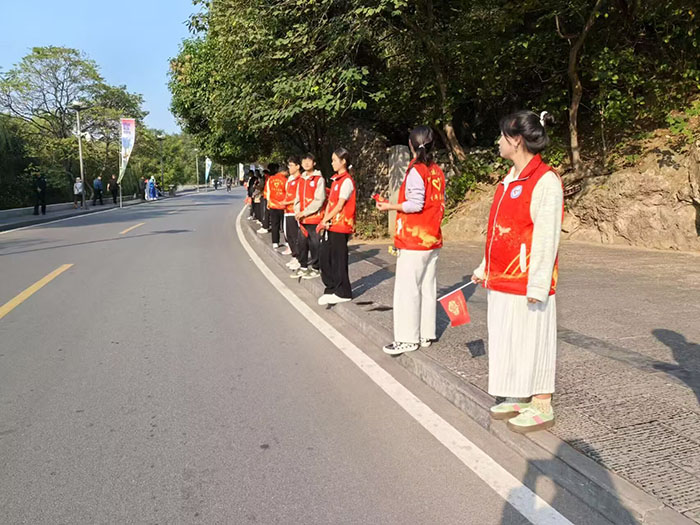 志愿者們身著統一服裝,準時抵達龍門石窟,精神抖擻。他們迅速明確任務,分組行動。一組志愿者挺立馬路兩側,手執彩旗,熱情迎接過往車隊,旗幟飄揚,彰顯著對客人的熱烈歡迎。另一組則協助安保人員維護秩序,穿梭于人群中,耐心引導游客,確保秩序井然。