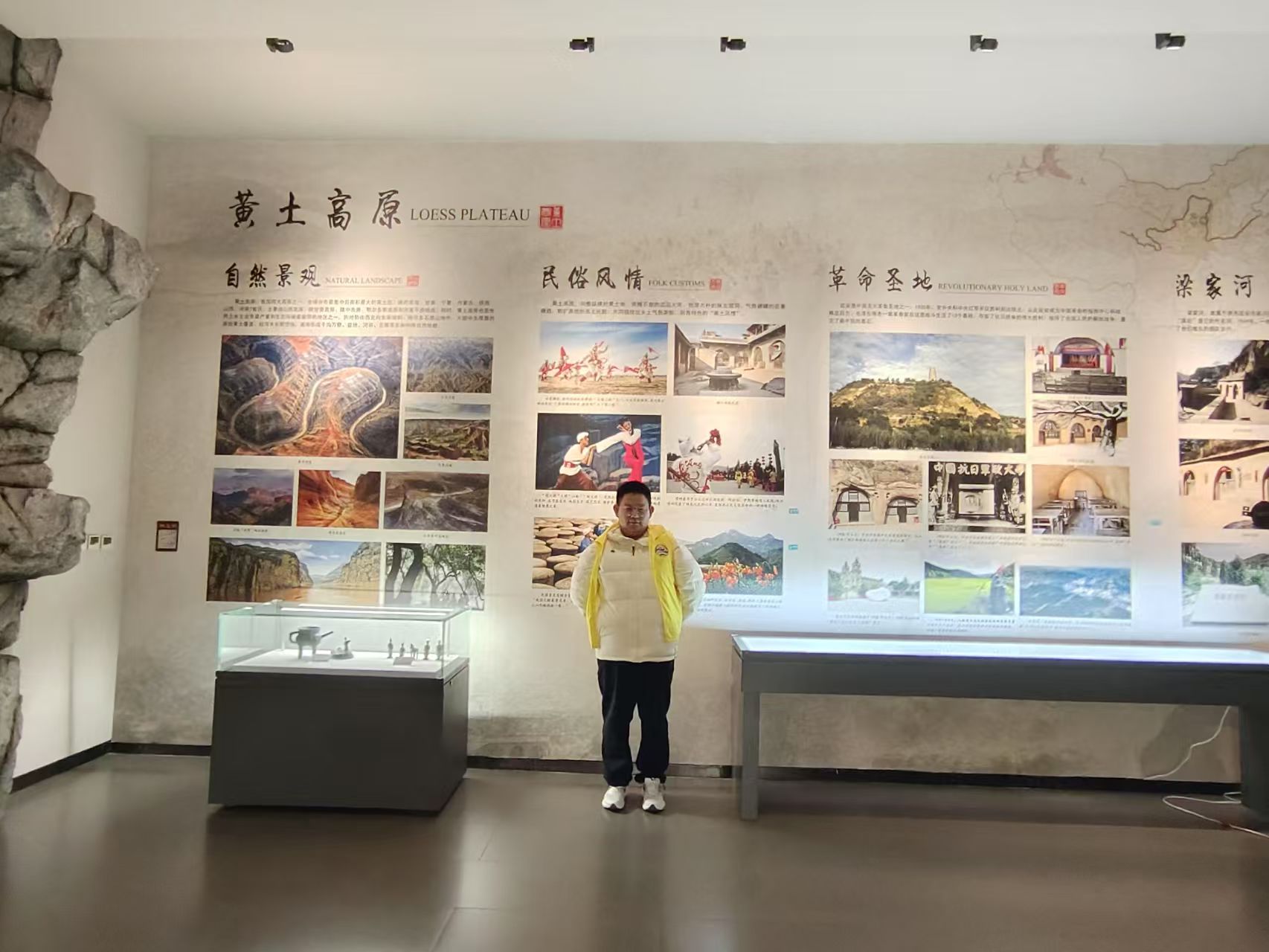 進入館內,實踐隊隊員來到黃土高原展示區。黃土高原位于黃河中游,墻上展示著這里的自然景觀、民俗風情、革命圣地以及梁家河等內容,有壯麗的山川圖片、獨特的民俗照片、莊嚴的革命圣地景象和梁家河的風貌,通過這些圖片與文字介紹,隊員真切感受到黃土高原的深厚底蘊。