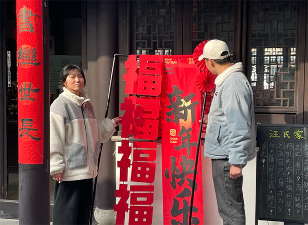 而在寫春聯區域,則是另一番熱鬧而溫馨的景象。筆墨飄香,同學們圍坐一桌,揮毫潑墨,將滿心的祝福與深情厚意融入春聯之中。春聯內容既有傳統的吉祥話,也有現代的創新詞句,每一副都飽含了對新春的期待與對市民的美好祝愿。團隊成員們將寫好的春聯贈予過往的市民,不僅傳遞了新春的溫暖與祝福,還拉近了彼此的距離,讓社區的年味更加濃厚。