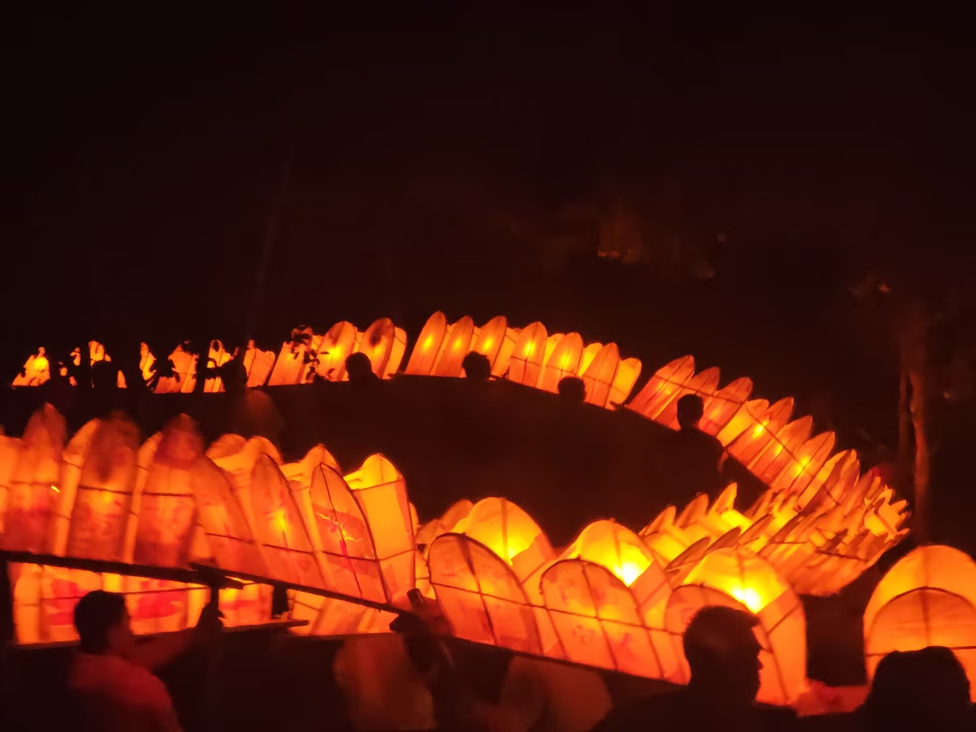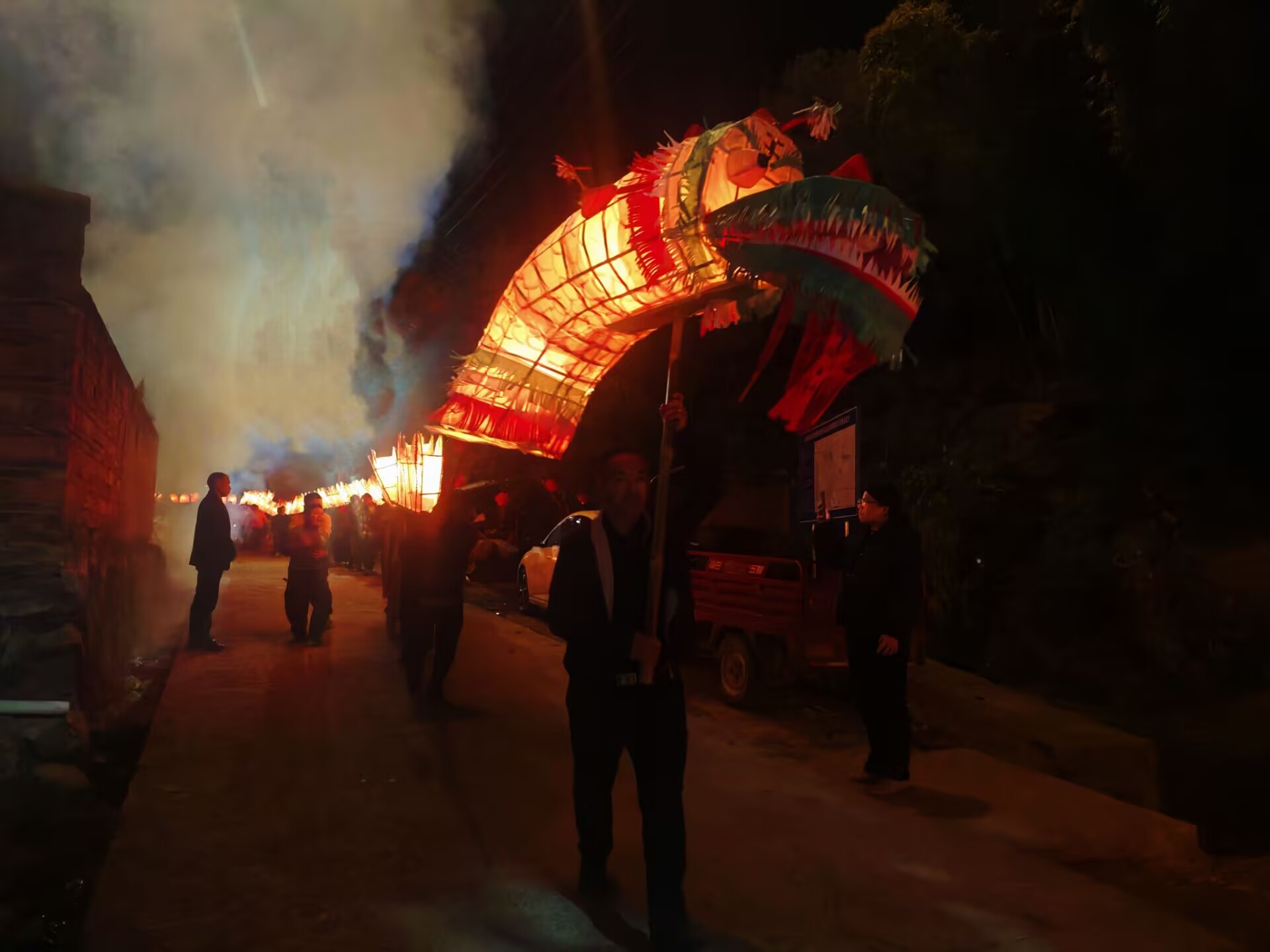 游龍燈的時候,由人抬著龍珠走在最前面緊隨其后的是龍頭,然后是家家戶戶的橋燈,最后是龍尾。旁邊是鑼鼓隊和禮炮隊。鑼鼓隊鼓敲兩下,鑼敲一下,發出“咚咚鏘、咚咚鏘”的聲音,邊走邊打。而各家各戶需要等候在自家門口,待聽見鑼鼓聲,立刻點燭燒香,“龍”一到立刻燃放煙花爆竹,這就是“接龍”,是村民們對來年風調雨順、萬事順遂、煙收糧豐的祈禱,祈求龍賜吉祥、所愿成真。還有一些村民會給“龍”包紅包,請“龍”到家周圍繞兩圈,希望自家來年好運連連,由好事發生!