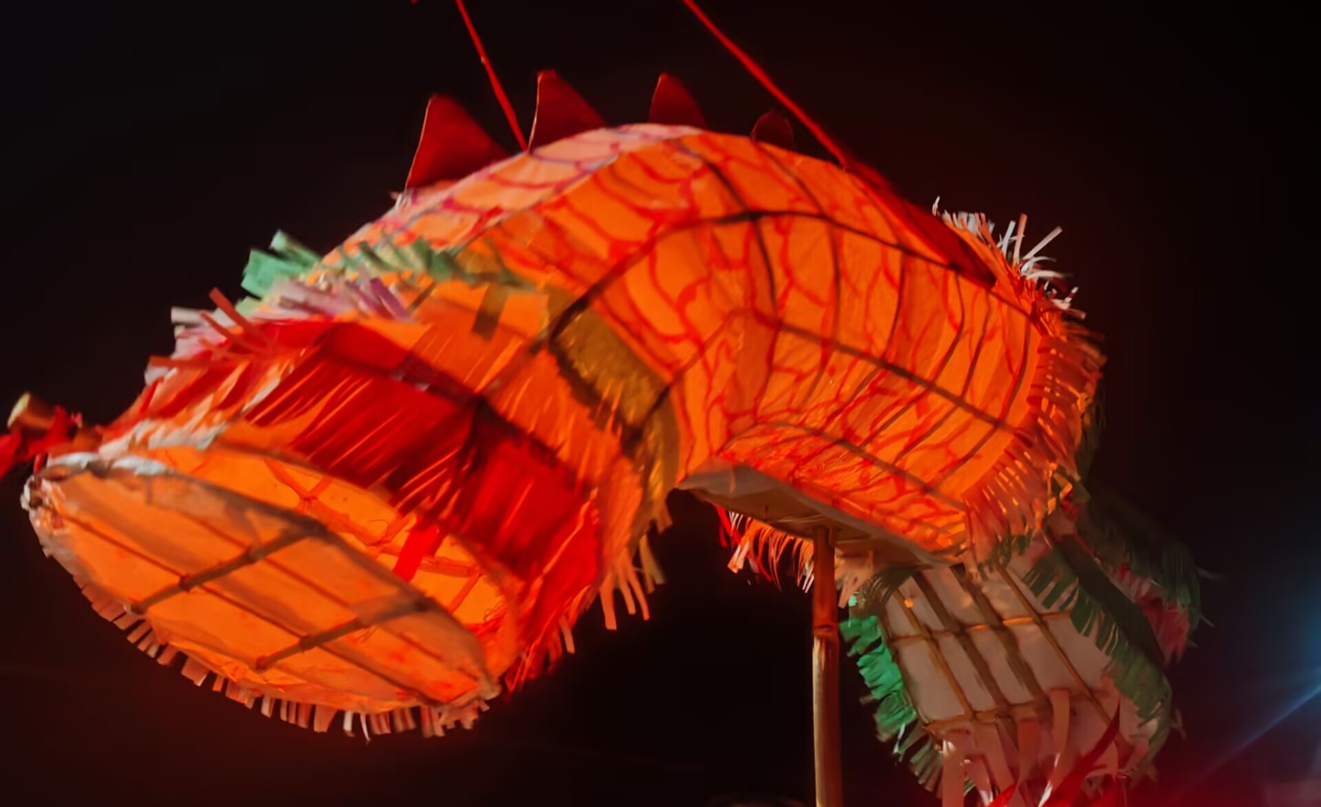 經實踐隊員調研了解,游龍燈的龍分為三部分,分別是龍頭、龍身以及龍尾。龍頭和龍身由竹子編織成型,再用彩紙糊好,龍嘴中或掛有一個八角小燈籠,燈籠八面寫著“四季平安”、“萬事如意”等村民們對新的一年的美好期盼;或銜有一顆龍珠,代表著威嚴。龍身又叫“橋燈”,每一戶有一橋燈,連接起來組成龍身。而一橋燈是由三個由竹子編織成拱形,固定在木板上,木板兩端各鑿一個圓洞,以便連接和栓上抬燈的木棒。長龍由幾百橋連接,短的也有幾十橋。