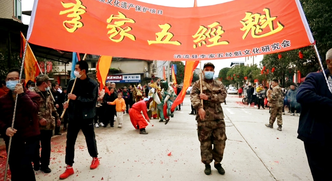 清流李家五經魁一年只有兩次與群眾見面,每年正月初三叫“經魁出行”,給群眾拜年。正月十四是清流縣李家鄉當地的“盛會佳期”(亦即廟會),“五經魁”再次出來巡演,隊伍后面還跟隨著嗩吶、十番鑼鼓伴奏以及鎮武祖師神像、花籠等。 每年正月初三的"經魁出行",巡游隊伍踏著千年古道的青石板,在嗩吶與十番鑼鼓的古老音律中蜿蜒前行。10公里的巡演路線串聯起李村、鮮水、河背三村,所經之處戶戶焚香鳴炮,用紅包串聯起民俗傳承的經濟鏈條。特別設計的雙人同飾角色制度,既暗合陰陽相生的古老哲學,又巧妙解決了傳承中的斷代危機。當鎮武祖師神像引領著花籠隊伍經過宗祠時,整個儀式完成了從娛樂表演到精神祭祀的升華。