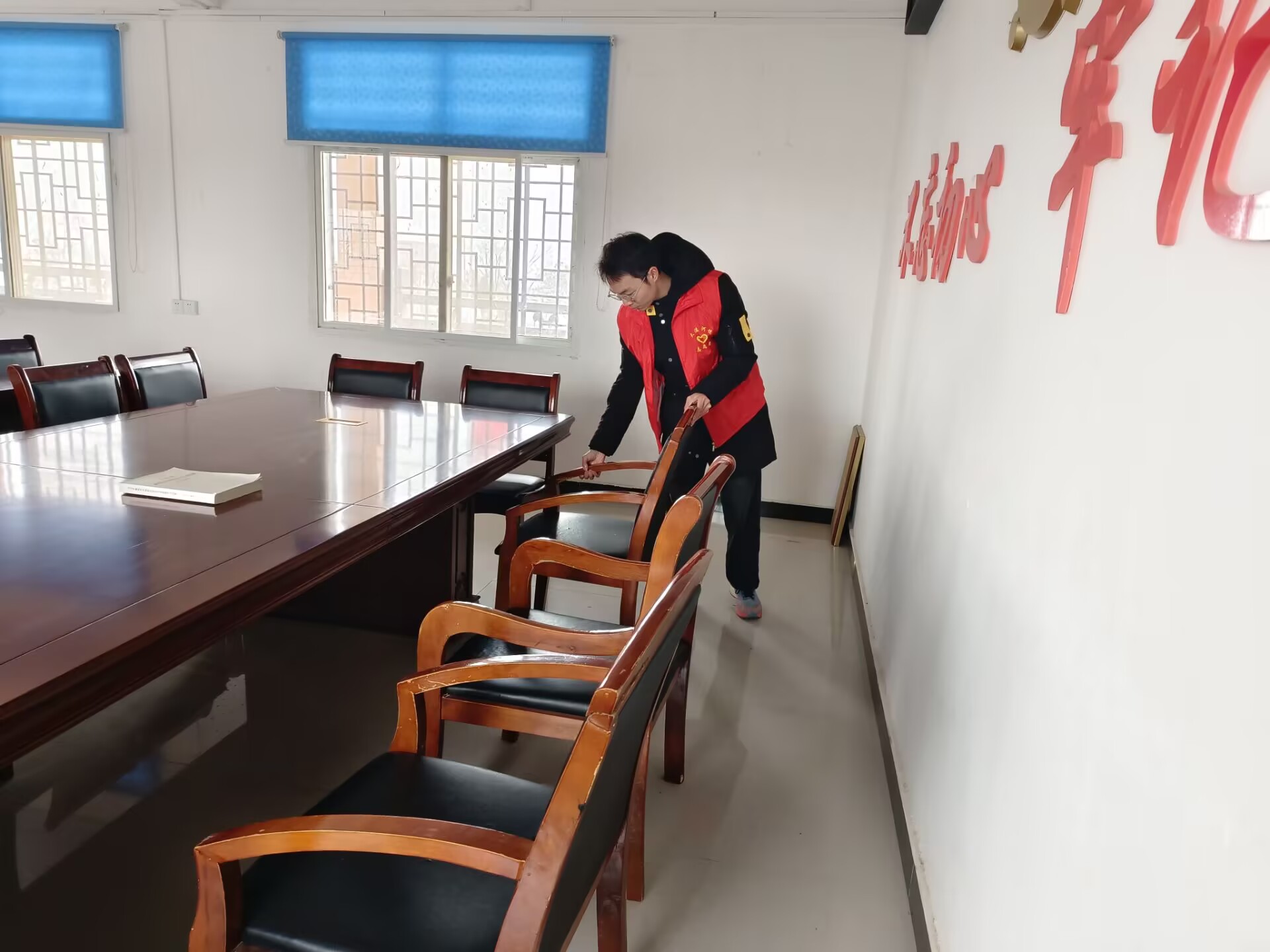 (圖為志愿者正在打掃會議室)