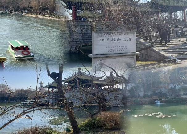 為了更直觀、更深刻地感受揚州傳統文化的獨特韻味,1月25日,小組成員前往瘦西湖進行實地參觀學習。冬日的湖面雖略帶寒意,但絲毫阻擋不了小組成員探索的熱情。他們沿著湖畔漫步,欣賞著亭臺樓閣、波光瀲滟的湖光山色,領略著揚州園林獨特的疊石理水、借景抒情的造園藝術。每一座橋、每一處廊,都承載著歷史的記憶。