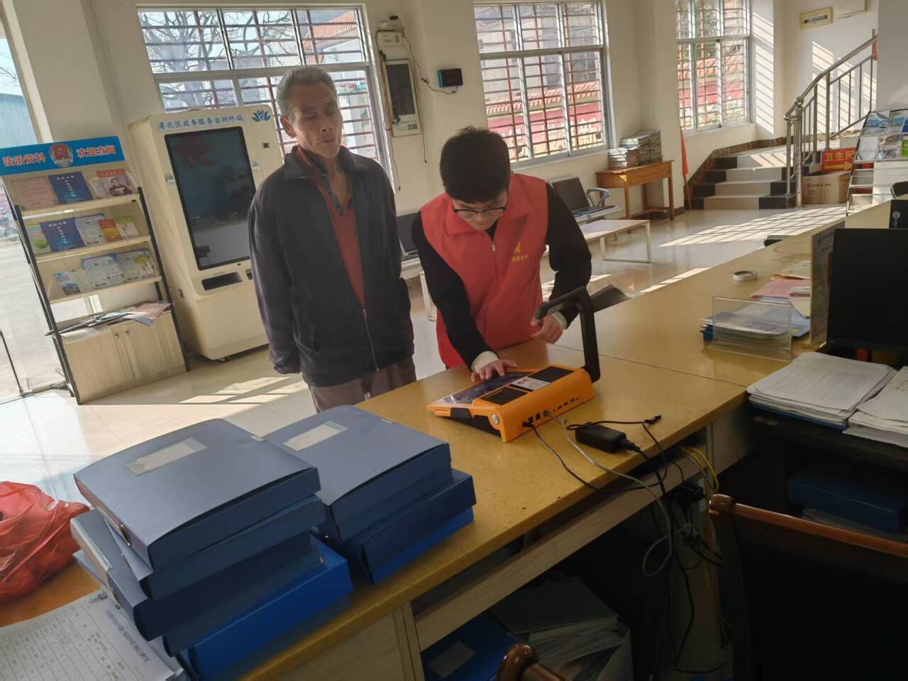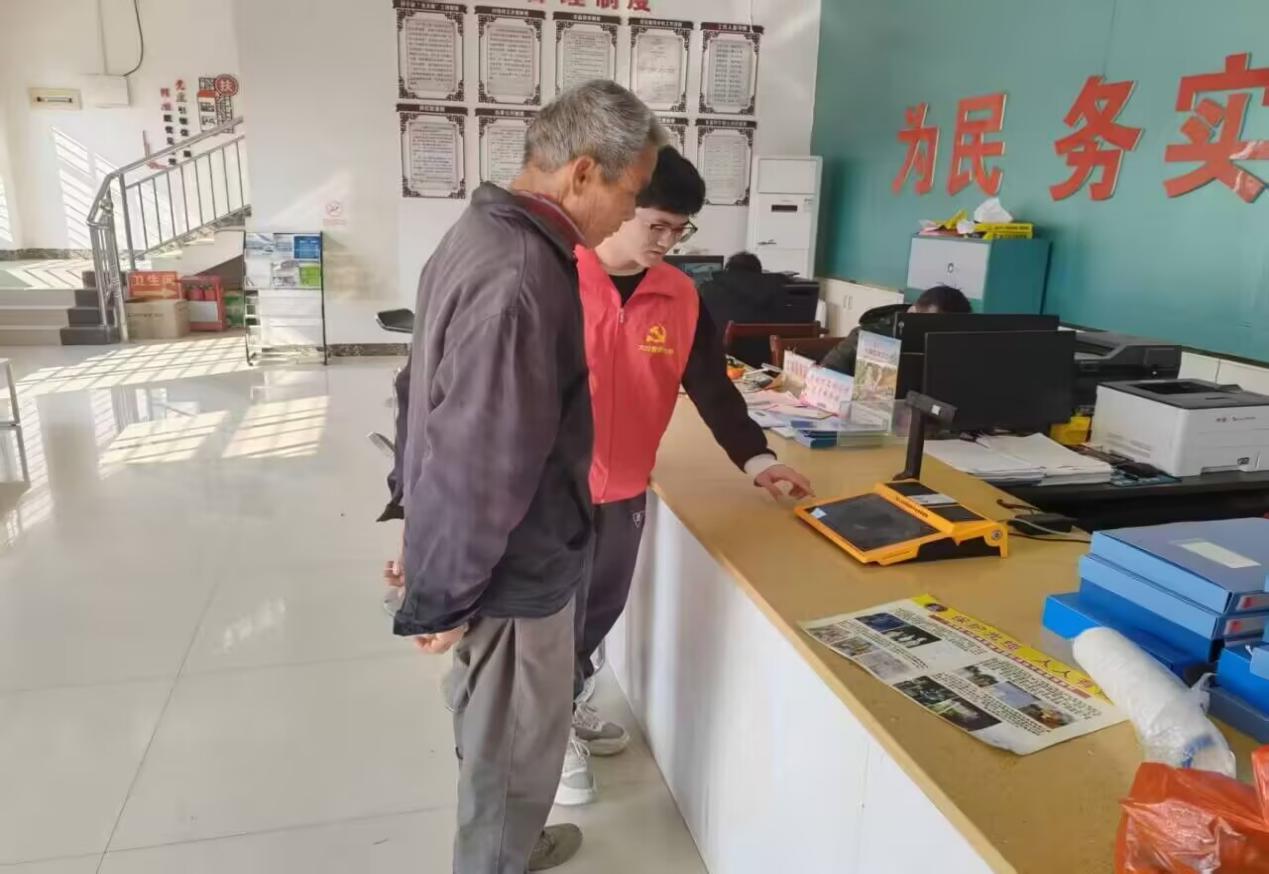 2月3日,在社區服務中心,海洋學院的志愿者們正忙碌地為當地居民提供著各種便民服務,在此次活動中,志愿者們耐心地向年長的長輩們介紹社區新的電子設備。在活動現場,居民站在左側,他穿著灰色褲子和黑色上衣,頭發花白,正專注地看著志愿者手中的機器。這位志愿者穿著醒目的紅色外套,熱情地向男性居民展示并解釋如何進行養老認證。背景中,文件和公告板整齊排列,上面貼滿了各種中文通知和宣傳材料。房間內部裝飾簡潔大方,墻上掛著一些物品,其中一個藍色的包格外引人注目。地板采用大理石紋理設計,給人一種整潔有序的感覺。圖片右上角,“為民務實”的橫幅高高懸掛,彰顯著此次活動的主題。