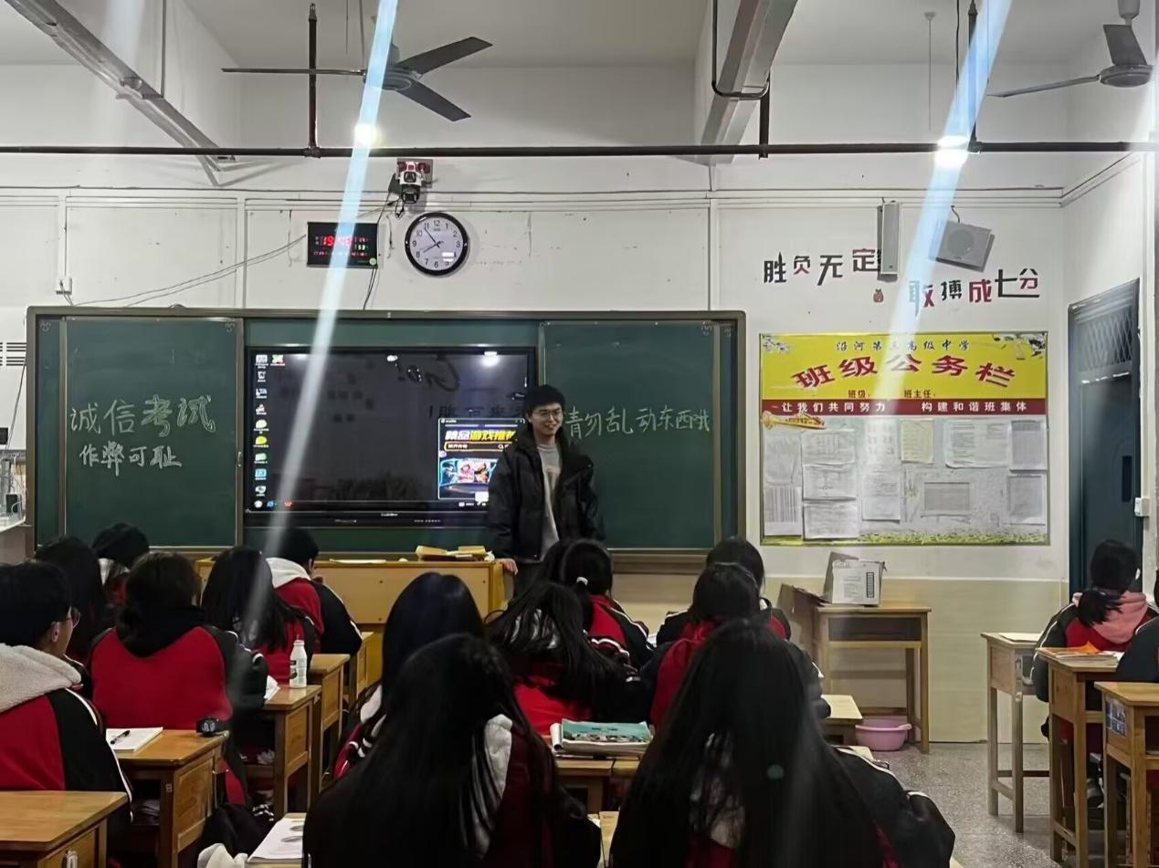 2月7日,寒假期間,海洋學院志愿者陳宇豪代表暖冬社區行基層服務實踐團于寒假期間回到高中母校開展招生宣傳活動。他們結合自身經歷,分享豐富多彩的大學生活,展示學校雄厚的師資力量、多元的學科設置,耐心解答學弟學妹關于報考、專業選擇等疑問,激發大家對江蘇科技大學的向往,為母校招生宣傳注入青春力量。