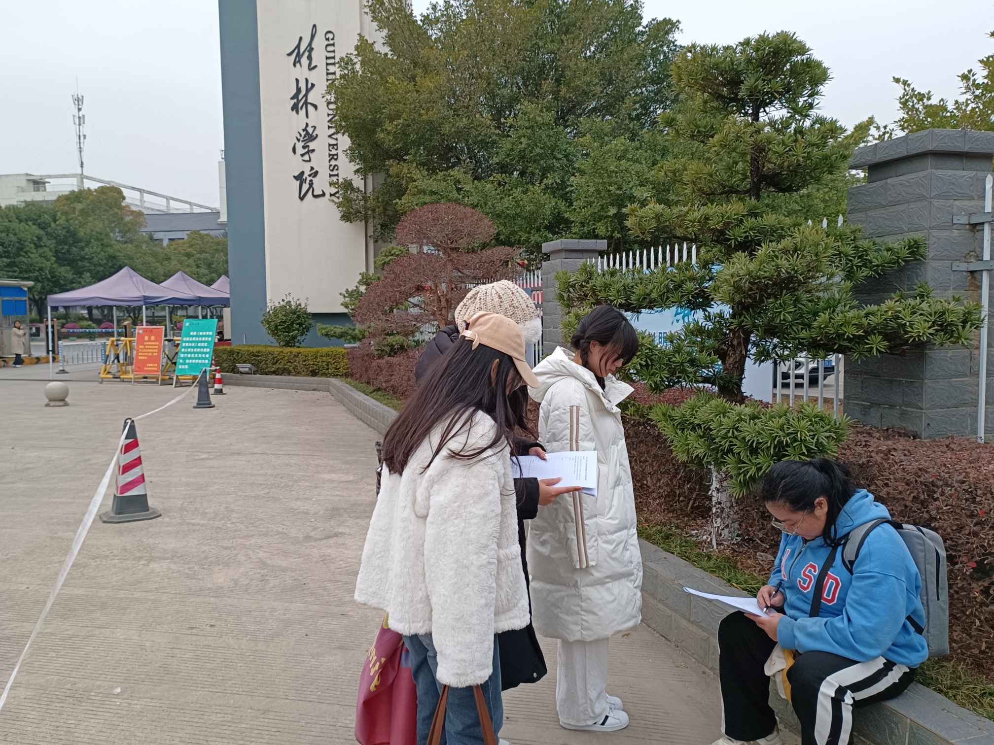 圖 2:圖為團(tuán)隊(duì)成員在桂林旅游學(xué)院門口與填寫問卷的同學(xué)交流。“熒屏馬跡” 團(tuán)隊(duì)供圖