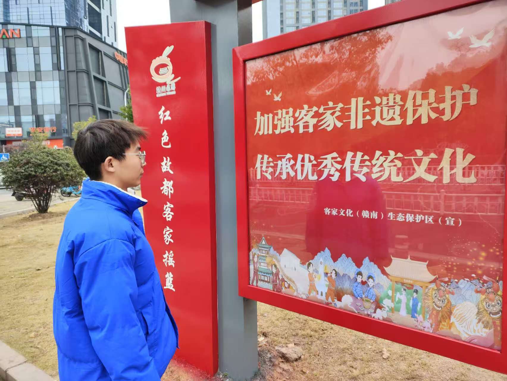 圖為“尋跡紅脈踐真知,鑄魂社區啟新程”實踐隊隊員在瀏覽客家文化的標牌。通訊員龔炫瑋攝