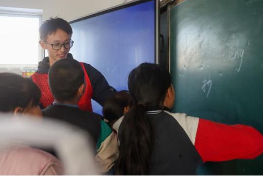 “人人那個(gè)都說(shuō)哎,沂蒙山好……”音樂(lè)教室內(nèi),《沂蒙山小調(diào)》的旋律穿越時(shí)空,在志愿者一字一句的教唱中,孩子們用方言嘗試演繹,稚嫩的歌聲里流淌著對(duì)軍民情深的致敬。