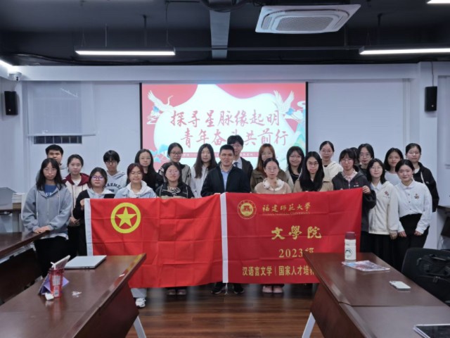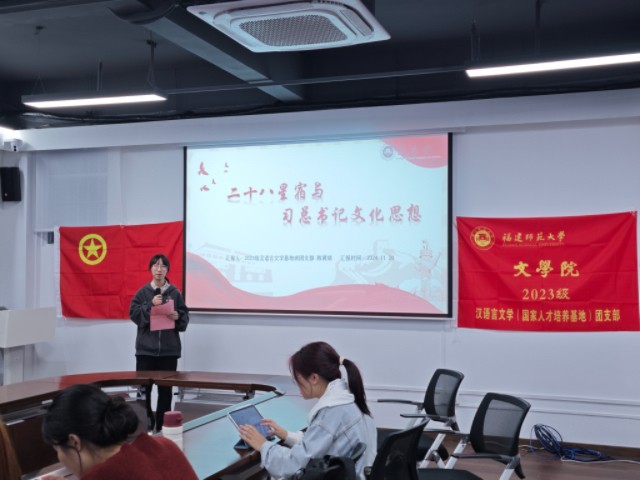 星續文脈,強國引航——記文學院23級漢語言文學(國家人才培養基地)團支部團日立項活動 11月20日下午,文學院23級漢語言文學(國家人才培養基地)團支部在倉山校區閩臺文教融合發展實驗室開展了主題為“探尋星脈緣起明,青年奮斗共前行”的團日立項活動。活動前支部成員認真品讀了《習近平著作選讀》,并在易班、QQ空間等平臺分享閱讀心得。活動現場,團支書林司婕為支部成員講述了“文化強國建設,青年勇于擔當”主題團課;陳黃婧同學結合習近平文化思想學習所得與二十八星宿傳統文化進行了分享;文學院講師肖滿省老師蒞臨現場講解《周易》中的二十八星宿文化知識,與支部成員進行學習交流。活動讓支部成員感受到了堅定文化自信的重要性,更加自覺地肩負起在傳承與發展中推動新時代文化繁榮的光榮使命。