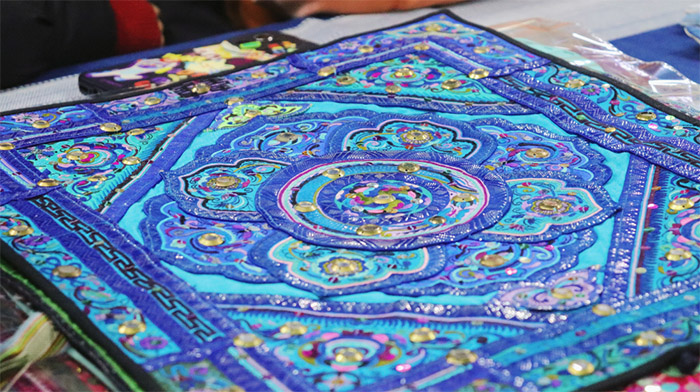 工作室的樓上便是生產(chǎn)車間,繡娘們有條不紊開啟新一天的工作。“韋慧英是最早跟隨我打拼的,在我公司時間最久的,雖然每個月工資不算多,但是公司也給她購買五險。”李伊園老師介紹道。車間里的繡娘臉上洋溢著幸福的笑臉,面對我們對其的收入關切,她們紛紛表示,這份刺繡工作操作靈活,還可以帶回家制作,既方便照顧孩子老人,可觀的收入又改善了她們的生活。