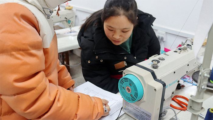 車間里有一位聽障人士,2015年從白云鄉(xiāng)楓木村搬遷到苗家小鎮(zhèn)的。團隊成員熱情采訪了這位阿姨,她雖不能以言語表達感激,但從她臉上滿足的笑容,揮舞的雙手,真切感受到了工作室的人文關懷。