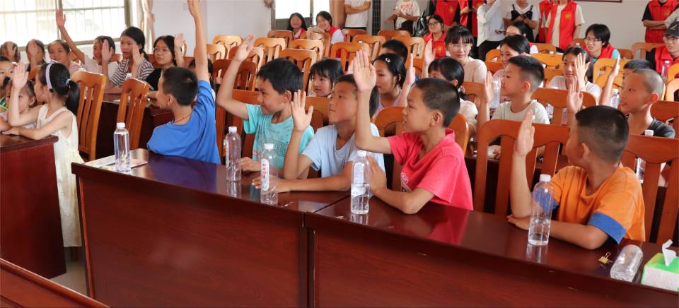 圖為實(shí)踐成員對(duì)小學(xué)生進(jìn)行普法提問(wèn),小朋友們積極回答