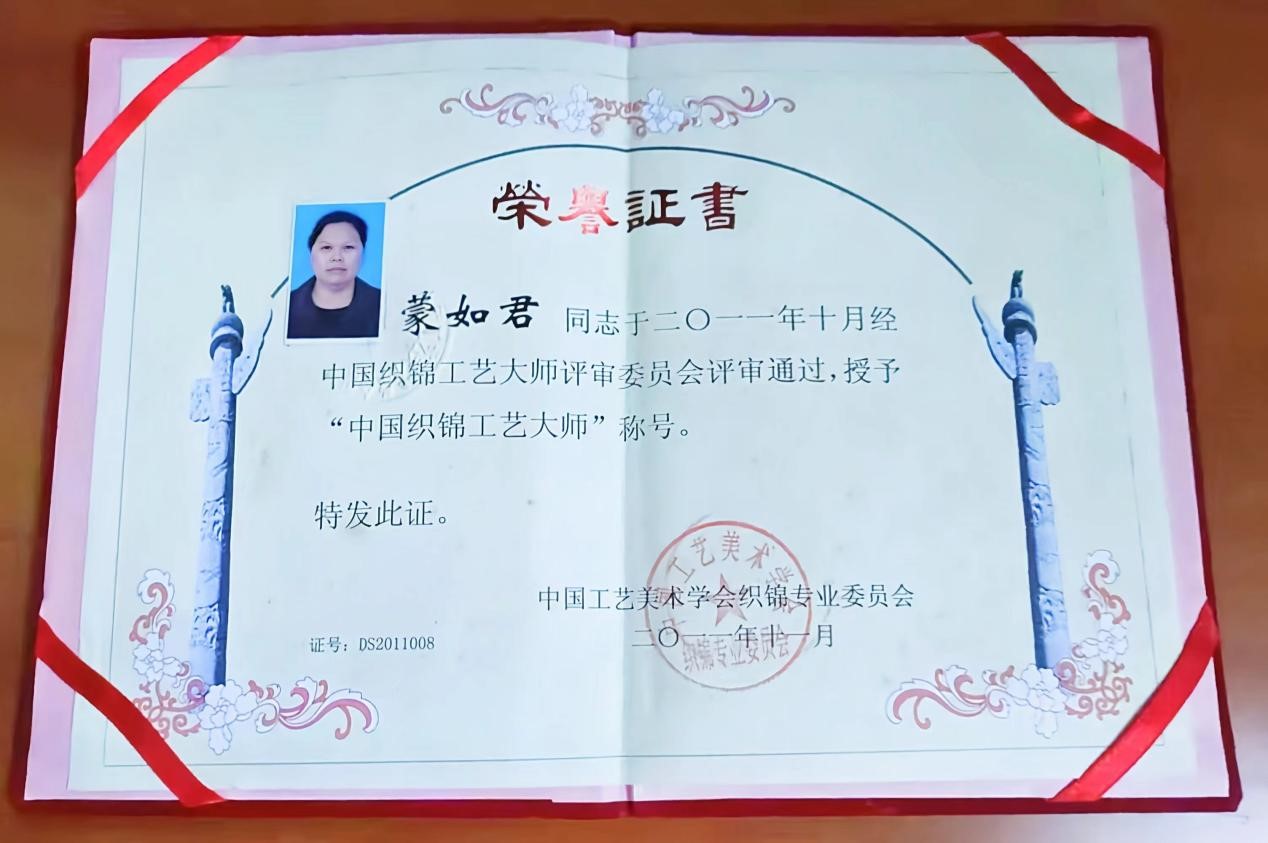 蒙如君出生于1957年,1972年,命運的齒輪開始緩緩轉動,她踏入壯錦制作的領域,在壯錦廠開啟了與壯錦相伴的漫長歲月。那時的壯錦廠,是簡陋的泥土房,條件艱苦得超乎想象,可她和另外六個人,懷揣著對未來的無限憧憬,一頭扎進壯錦的學習中。時光匆匆,一晃二十余載。到了1993年,市場經濟的浪潮洶涌襲來,壯錦廠沒能扛住沖擊,無奈倒閉。曾經熱鬧非凡的廠房變得冷冷清清,一同奮斗的伙伴們也紛紛另謀出路。然而,蒙如君卻割舍不下這份深入骨髓的熱愛,她沒有被現實打倒,毅然決然地選擇堅守。她將家里的一角改造成小小的工作室,搬出那臺陳舊卻無比熟悉的織錦機,繼續在經緯之間穿梭,讓壯錦的絢麗在歲月中延續。