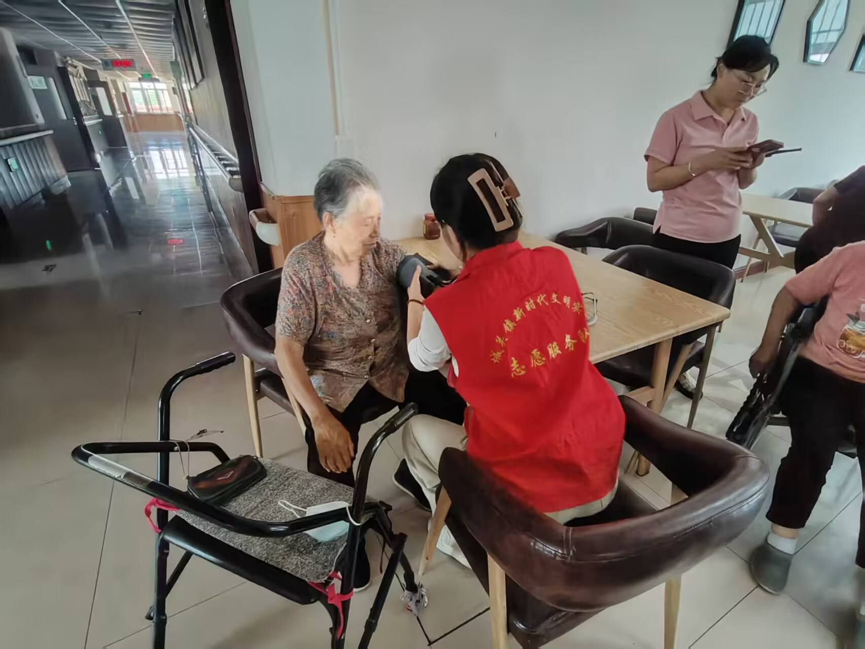 6月22日至24日,學子們每日清晨便來到長者身邊。上午九時,療養院活動場準時開展健身指導。志愿者們站在長者身旁,耐心示范動作,帶領大家伸展手臂、活動關節、抬腿鍛煉。盡管夏日炎炎,長者們熱情高漲,臉上洋溢著笑容,既鍛煉了身體,也拉近了心與心的距離。隨后,志愿者協助分發積分卡,并攙扶行動不便的長者返回居室。在居室內,他們細心為長者測量血壓,規范操作、輕柔細致,并耐心講解結果與日常注意事項,贏得長者們對專業與細心的稱贊。6月25日,學子們再次拿起清潔工具,一絲不茍地打掃房間與公共區域,汗水浸透衣衫亦無怨言,只為給長者營造更整潔舒適的家園。