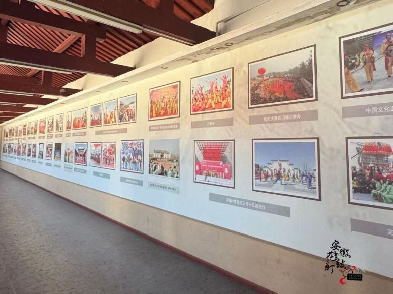 清晨,團隊成功抵達了充滿現代化氣息的馮咀子花鼓燈生態保護村。走進傳習所內,我們看到所內珍藏著現今“馮派”傳承人譜系與許多歷史資料。朱老師向團隊成員們逐一介紹館內珍藏的照片,圖片上記載著從建國初期至今的各大演出盛況。扇花飛舞,鑼鼓升平,舞蹈演員們姿態矯健,身段柔美,F場的氣氛洋溢著熱鬧歡快的節慶氛圍,傳遞出安徽花鼓燈濃厚的歷史底蘊與文化的魅力。