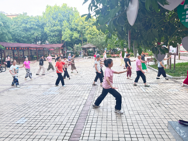 “天地守中氣血通,投足舉手態從容。”傍晚時分,社區里的老人們陸陸續續來到了廣場上,團隊成員們迅速開展了太極拳教學,有了昨日的基礎,老人們很快進入狀態。盡管夏日炎炎,但老人們的學習熱情絲毫不減。他們認真跟隨隊員們的節奏,一招一式有板有眼,臉上洋溢著專注與喜悅。這一太極拳教學活動,不僅豐富了恒通社區老年人們的精神文化生活,更展現了安徽師大學子積極向上的精神風貌和傳承弘揚中華優秀傳統文化的責任擔當,為傳統文化的傳承與發展貢獻了青春力量。