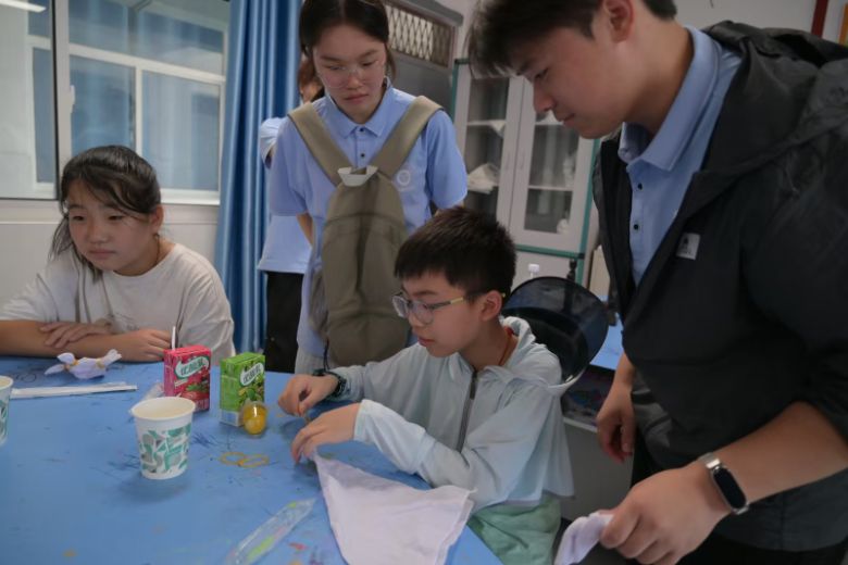 在廣德市新杭鎮中心小學的扎染課堂上,志愿者通過 “示范-實踐-展示”三階教學法展開指導:學生首先學習折疊布料、捆扎防染技巧,隨后將作品浸入天然板藍根染液。氧化拆解環節中,素白方巾幻化出獨特紋樣,引得課堂驚嘆連連。本次支教活動將扎染的“防染顯花”科學原理及其紋樣文化融入實踐體驗,打破非遺認知的壁壘。通過動手實踐,激發鄉村學生的美育創造力,一件件原創作品充分印證了“做中學”的教學成效。此舉不僅搭建了高校與鄉村小學之間的美育橋梁,更為傳統文化在基層的扎根提供了可持續的發展范式。