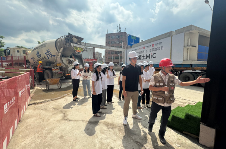 03定位行業前沿創新科技,感受裝配式建筑智慧轉型 為了深入了解MiC(模塊化集成建筑)技術的應用與發展,深圳實踐團成員前往中國建筑國際深圳福城南項目,技術專家帶領團員們考察調研了該項目現場,詳細講解了MiC技術如何在實際施工中實現模塊化、標準化和工業化生產,顯著提高了建筑的施工效率和質量。現場專家還介紹了MiC技術的四大核心優勢:高效率、高質量、綠色低碳和節材省工。在福城南項目中,所有MiC建筑構件都經過精密設計和工廠預制,在施工現場只需進行組裝,極大地節約了施工周期,提高了建造效率。