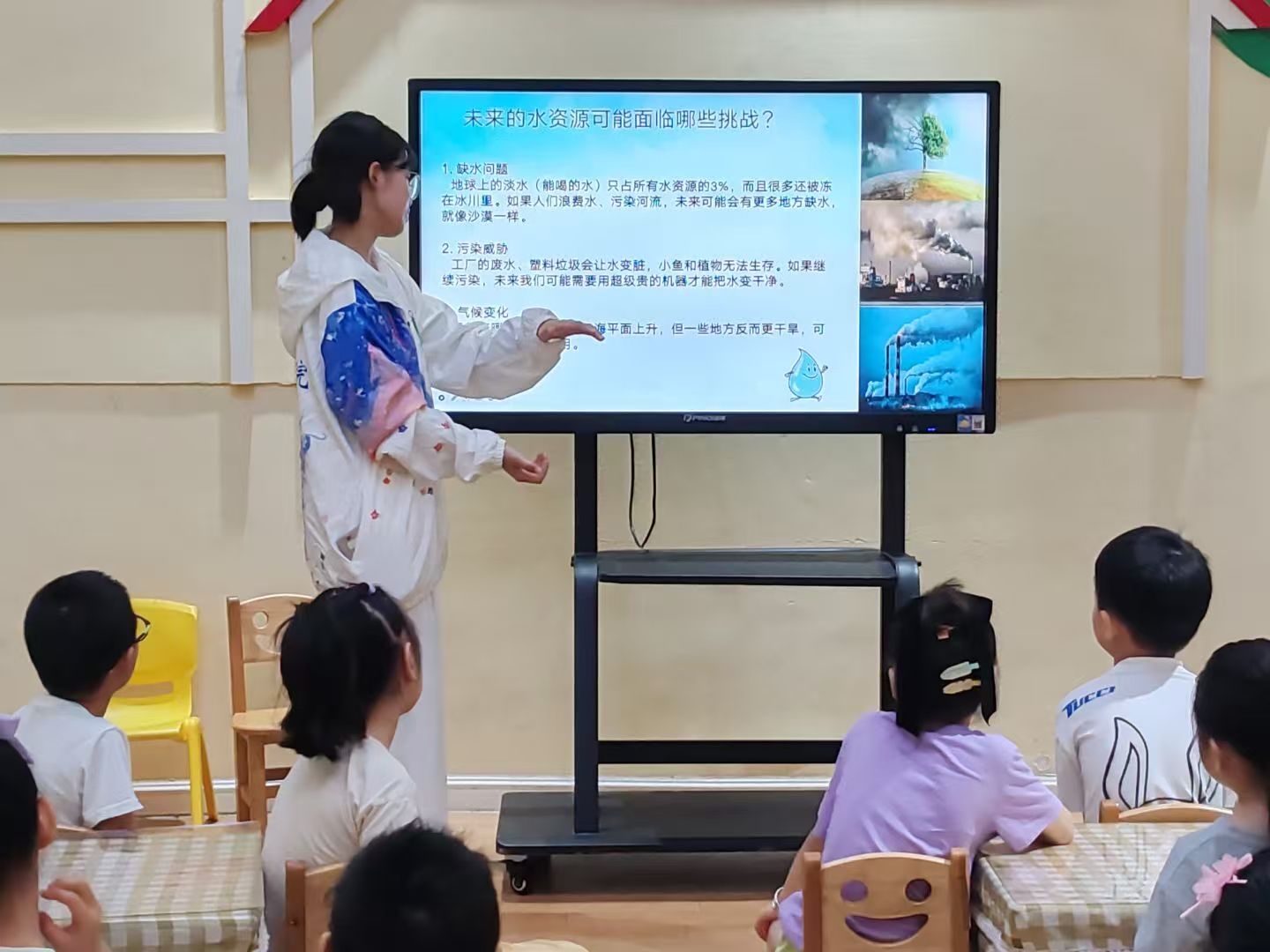 隨后,宣講中穿插著充滿童趣的動畫,畫面中可愛的卡通形象和簡單易懂的情節(jié),迅速吸引了孩子們的注意力。通過動畫,孩子們直觀地了解到水在日常生活中的重要作用,從飲用、洗漱到灌溉、工業(yè)生產(chǎn),水無處不在,是生命不可或缺的物質(zhì)。