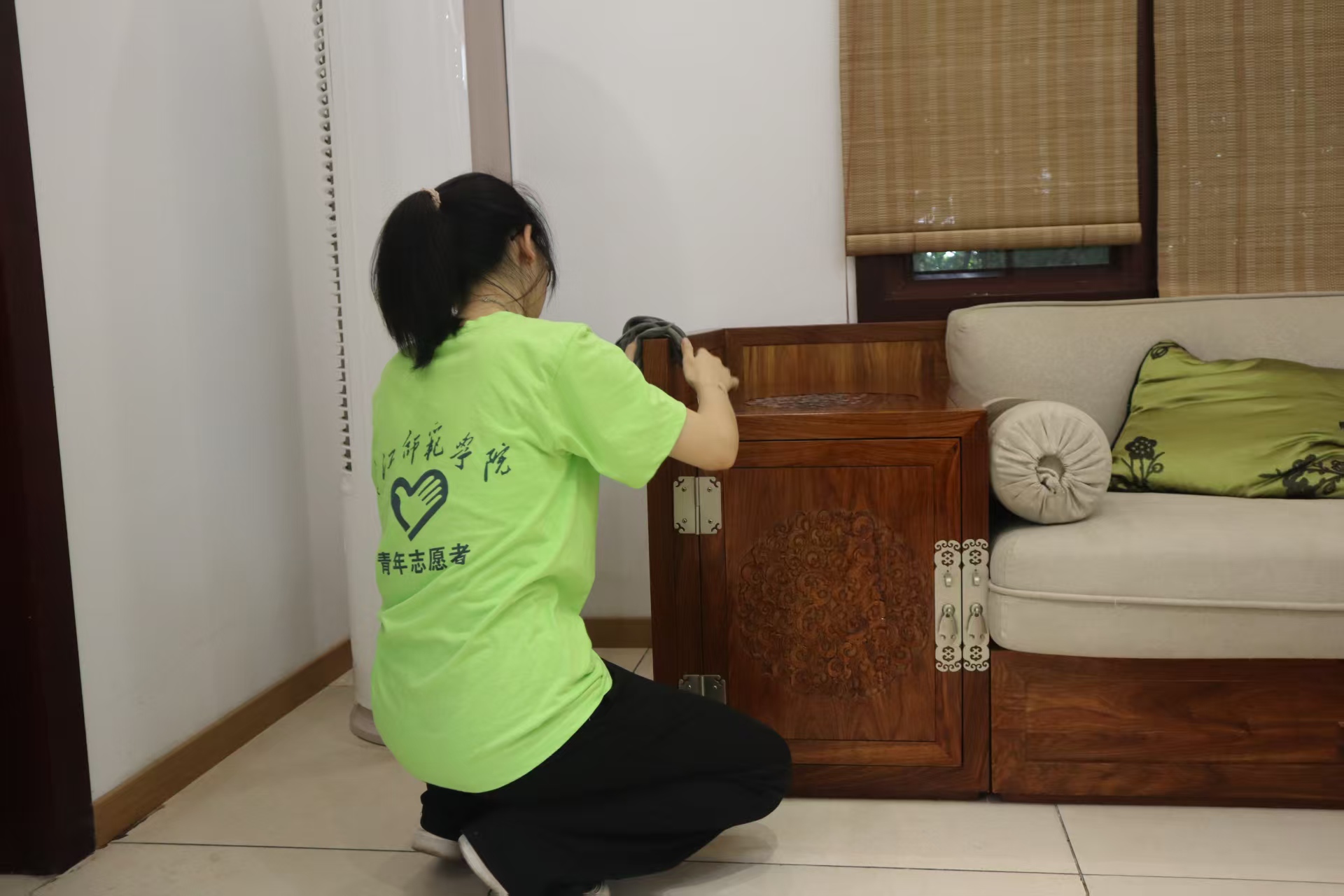 活動現場,團隊成員分工明確、配合默契。有的隊員手持掃帚,認真清掃每一個角落,不放過一片紙屑、一絲灰塵;有的隊員專注擦拭座椅,從椅面到椅背,每一處都擦得光亮如新;還有的隊員拖著沉重的拖把,來回拖洗地面,讓地板變得干凈整潔。盡管天氣炎熱,汗水濕透了隊員們的衣衫,但他們沒有絲毫懈怠,始終保持著高漲的熱情和認真負責的態度。
