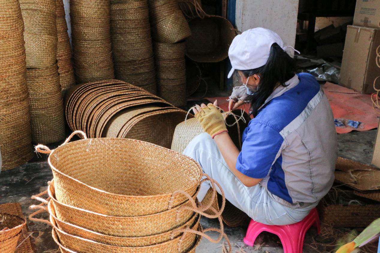 連線了當地的工作人員,展示了精湛的蒲草編織工藝,一根根普通的蒲草在工作人員手中,經過巧妙的編織、造型,變成了精美的籃子、墊子等工藝品。