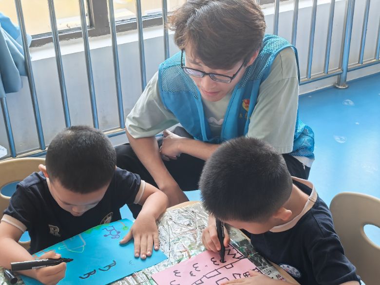 講解結(jié)束后,繪畫(huà)環(huán)節(jié)成為全場(chǎng)焦點(diǎn)。孩子們拿起畫(huà)筆,在志愿者的引導(dǎo)下,將心中對(duì)古建筑的印象轉(zhuǎn)化為色彩斑斕的畫(huà)面:有的畫(huà)了帶著彩虹頂?shù)墓庠罉牵械慕o山陜會(huì)館的柱子畫(huà)上了卡通花紋,還有的在建筑周?chē)砩狭吮寂艿男?dòng)物。志愿者們蹲在孩子們身邊,一邊幫他們調(diào)整色彩搭配,一邊傾聽(tīng)他們對(duì)作品的"解說(shuō)",現(xiàn)場(chǎng)充滿歡聲笑語(yǔ)。