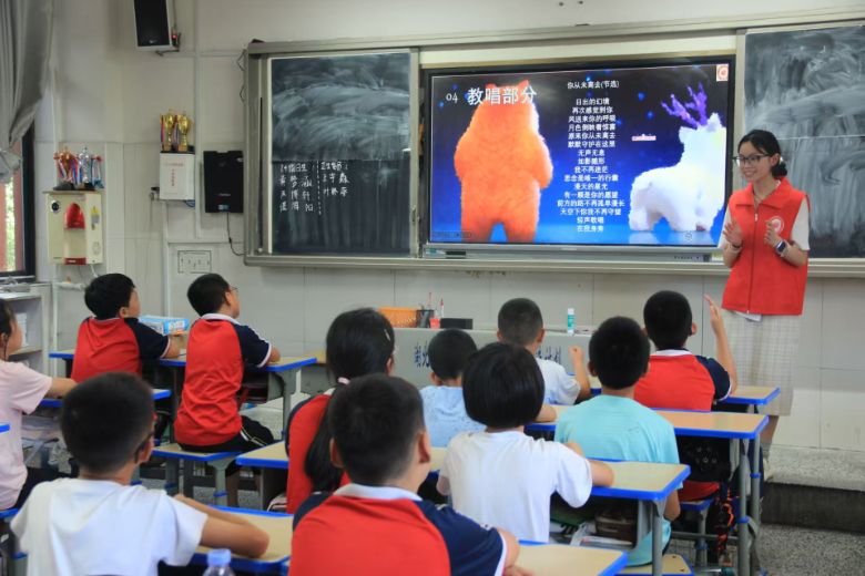 圖為志愿者在音樂課堂上帶領孩子們唱歌。多彩大學生網通訊員范兆熙供圖