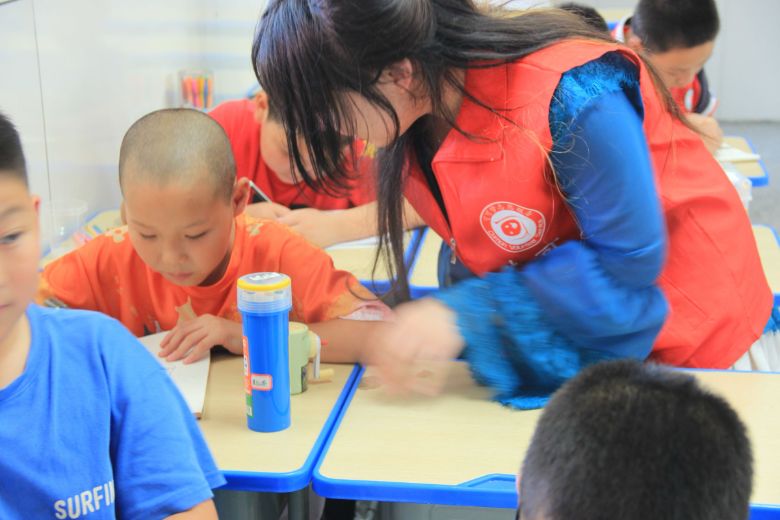 圖為志愿者老師指導(dǎo)學(xué)生畫(huà)畫(huà)。多彩大學(xué)生網(wǎng)通訊員王文秀攝